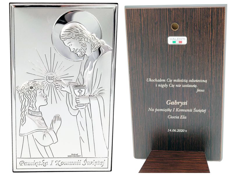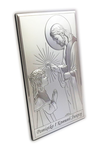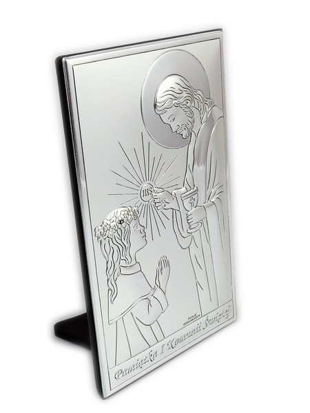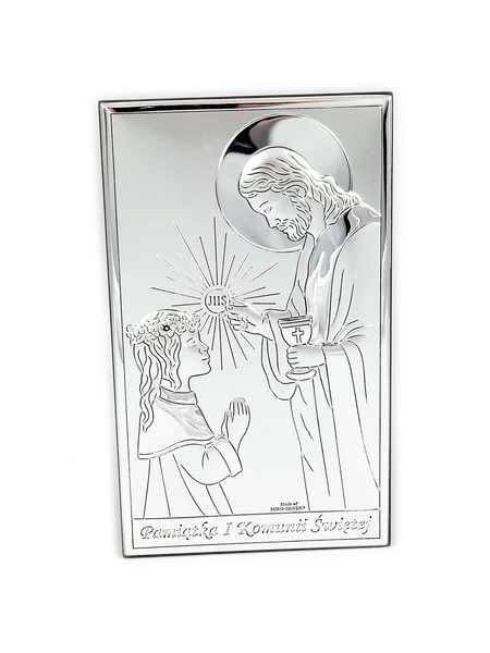 Srebrny obrazek to "Pamiątka I Komunii Św. z Panem Jezusem udzielającym Komunię dziewczynce - JAP761".