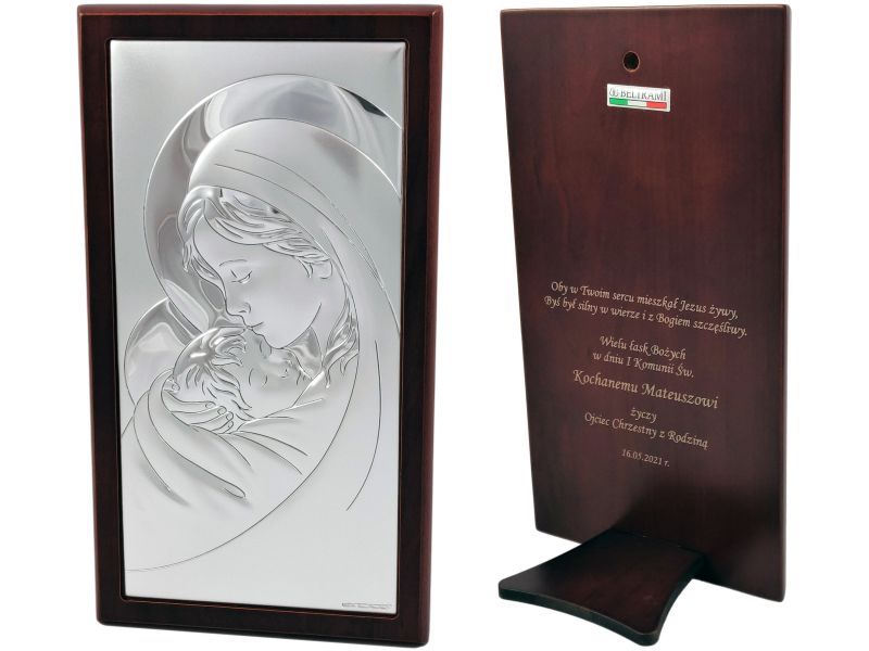 Pamiątka I Komunii Św. - srebrny obrazek Maryja z dzieciątkiem 6381WM z grawerem