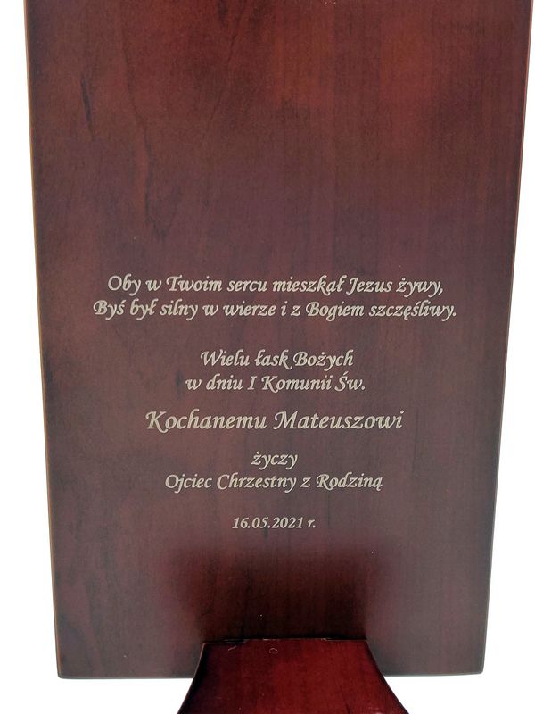 Na odwrocie obrazka wygrawerowana jest pamiątkowa dedykacja z okazji przyjęcia I Komunii Św.