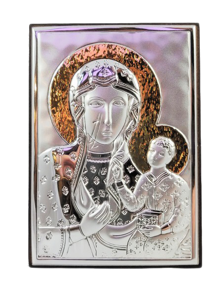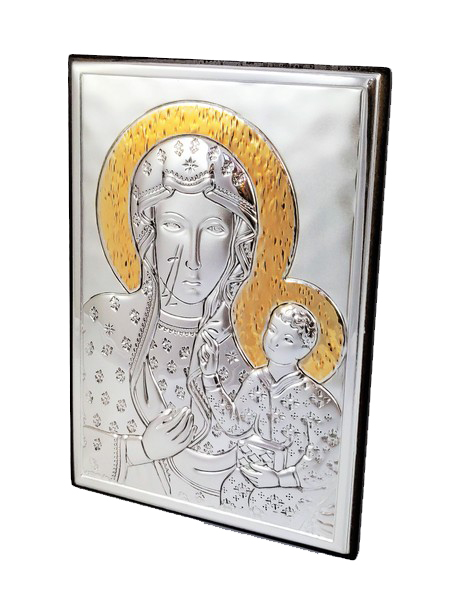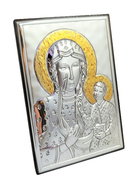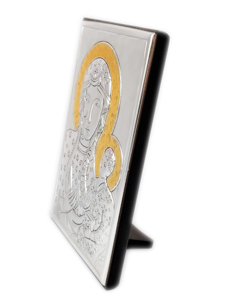 Srebrny prostokątny obrazek to "Matka Boża Częstochowska 6323ORO" ze złoceniami.