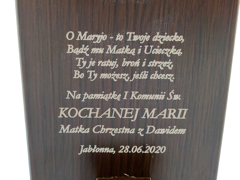 Grawer dedykacji wykonany jest bezpośrednio w drewnie lub na dołączonej tabliczce.