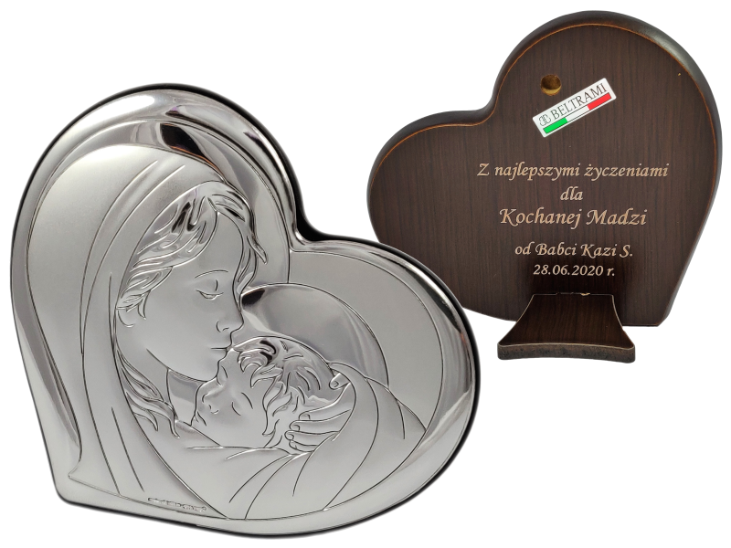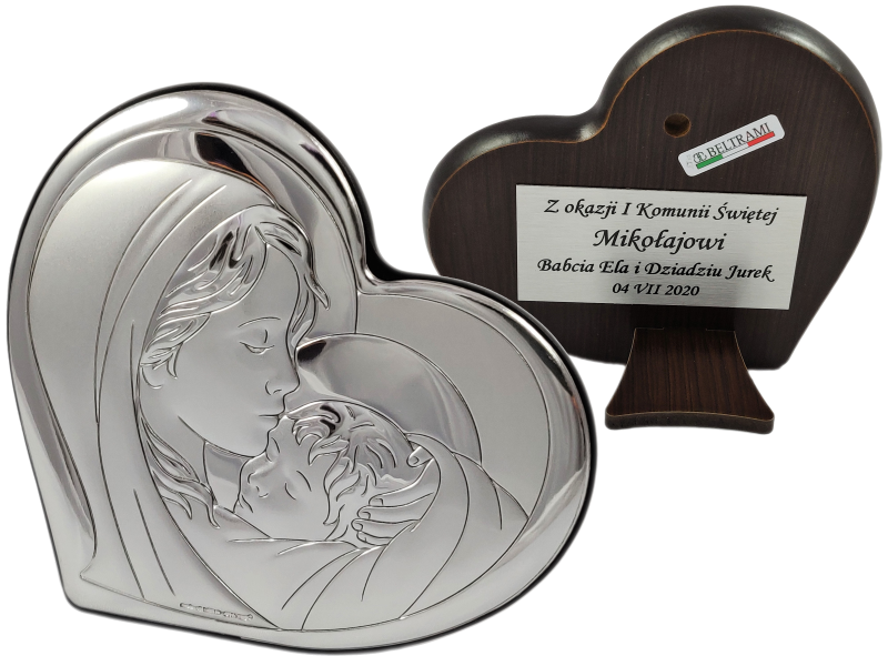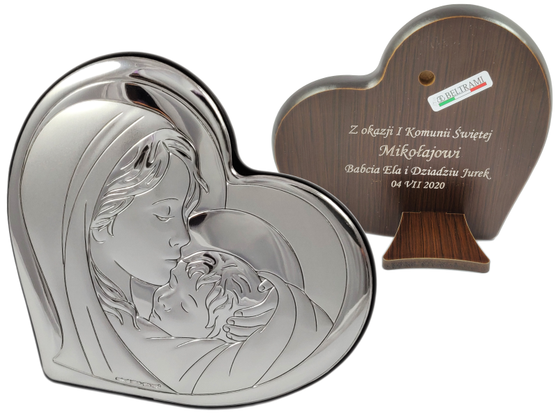 Upominek z okazji przyjęcia Pierwszej Komunii Świętej w postaci srebrnego obrazka z Matką Bożą z dzieciątkiem z grawerem.