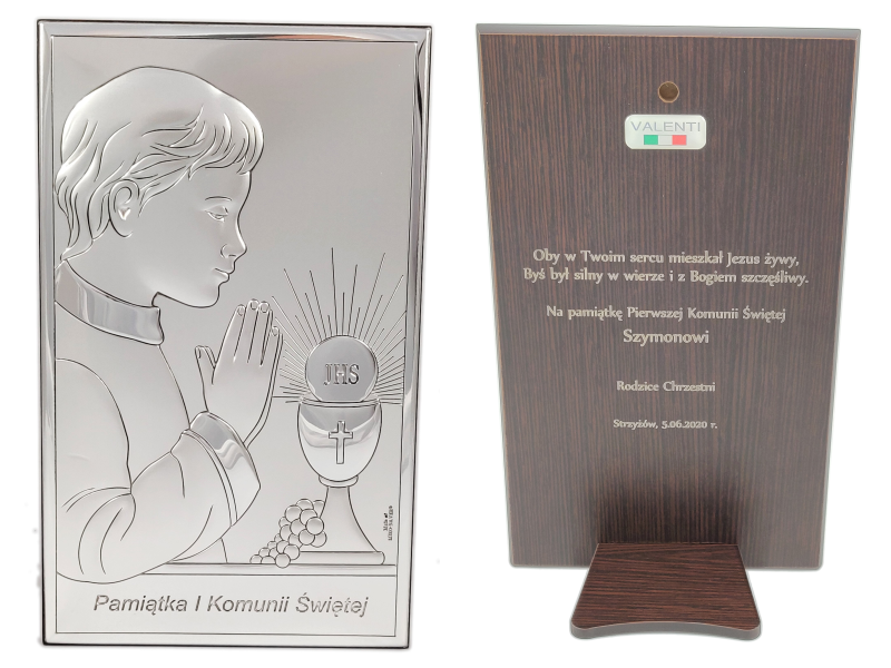 Upominek z okazji przyjęcia Pierwszej Komunii Świętej dla chłopczyka w postaci srebrnego obrazka z grawerem.