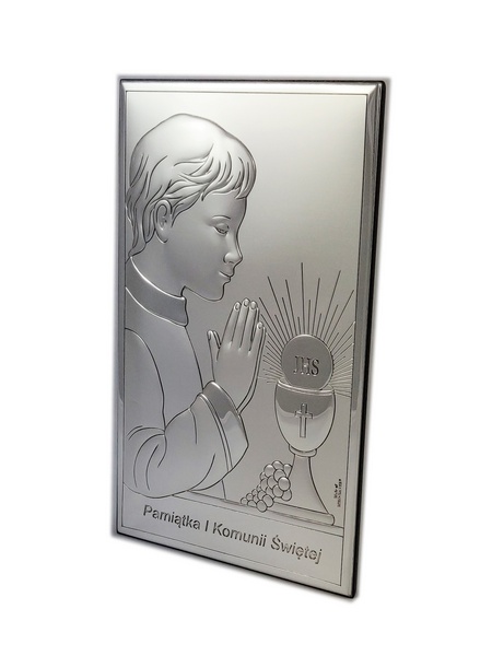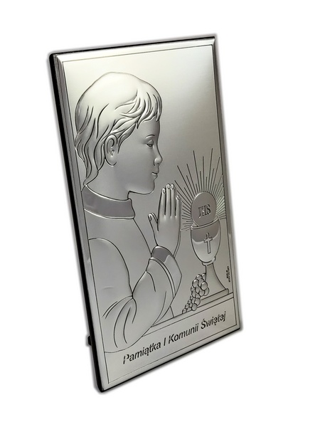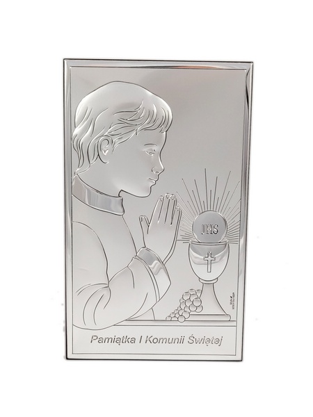 Srebrny obrazek "Pamiątka I Komunii Św. z chłopczykiem, kielichem i Hostią - JAP758".