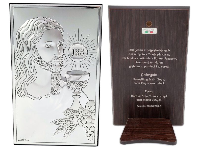Upominek z okazji Pierwszej Komunii Świętej w postaci srebrnego obrazka z Panem Jezusem, Hostią i kielichem z grawerem.