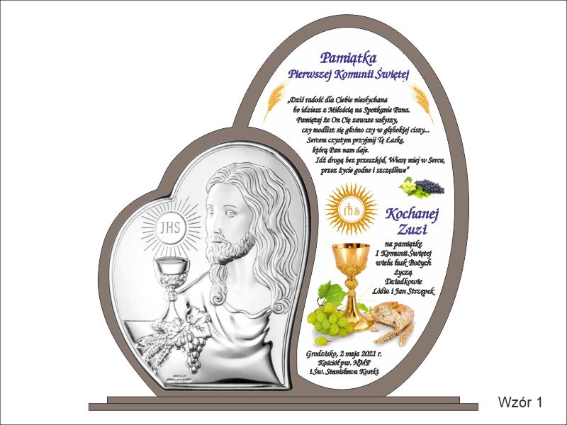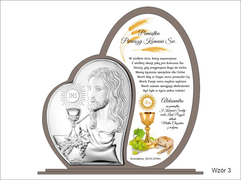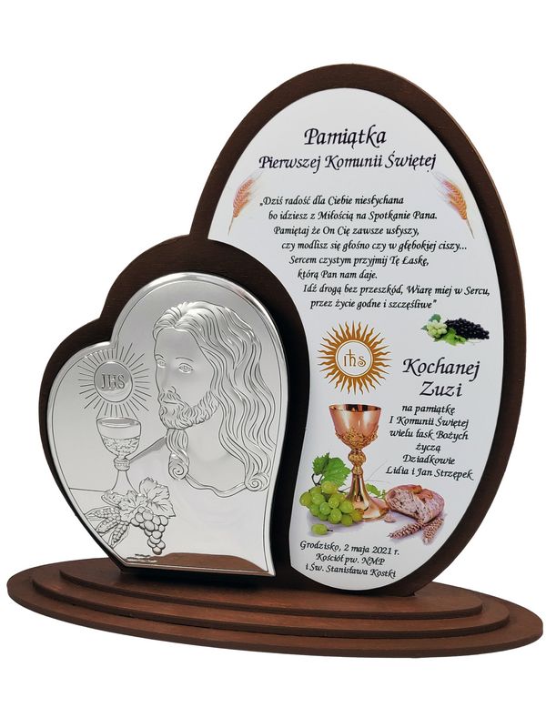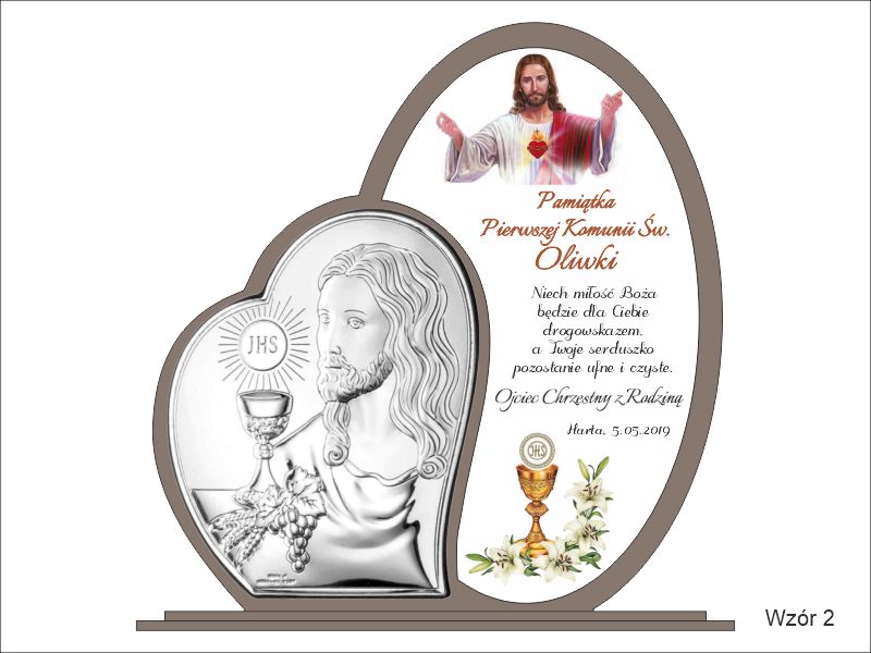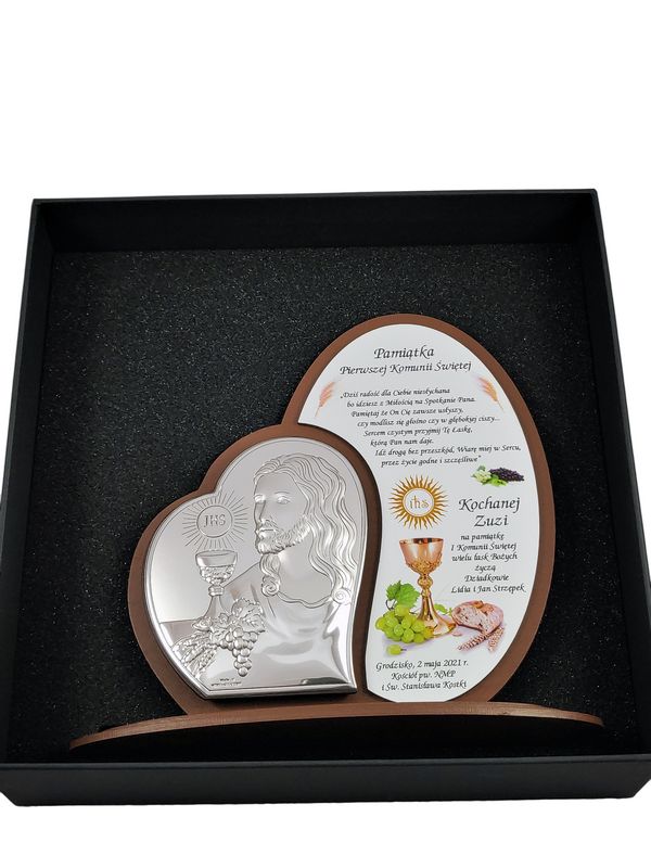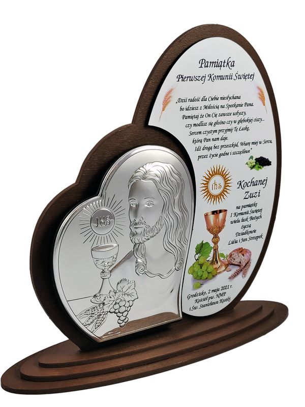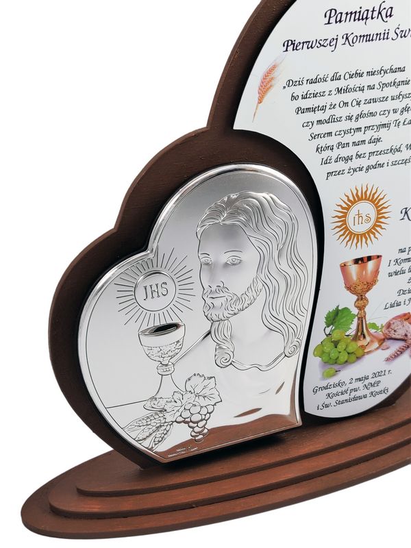 - z obrazka srebrnego "Jezus Chrystus z Hostią i kielichem - 81124" w kształcie serca wielkości 9 x 11 cm,