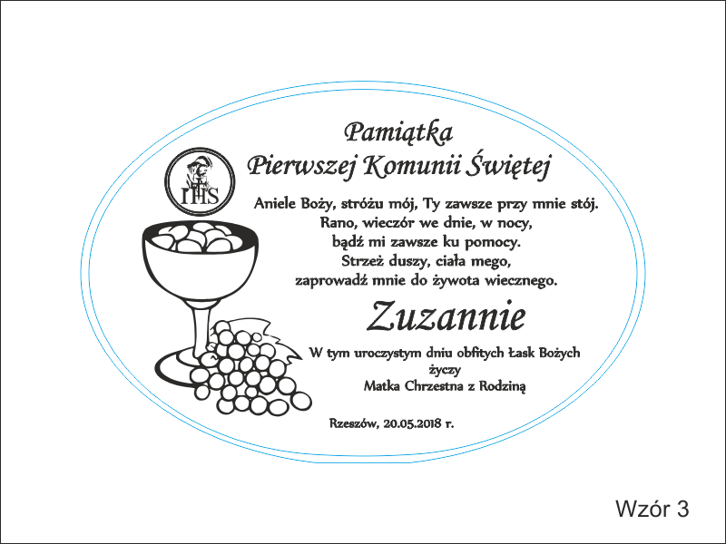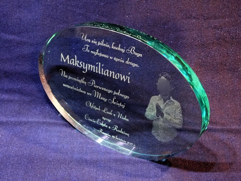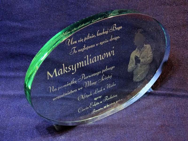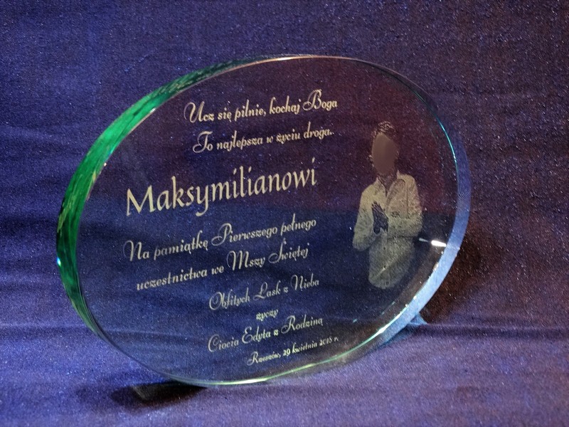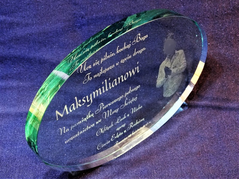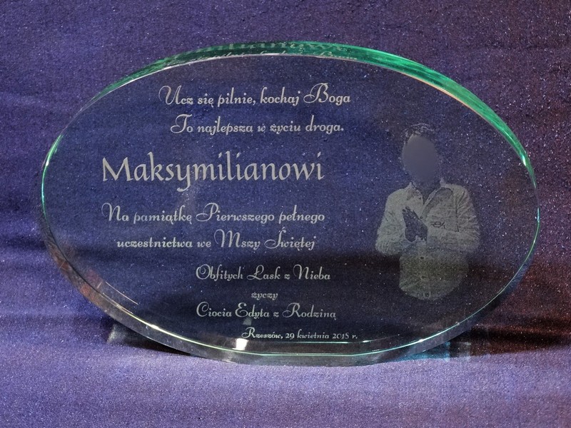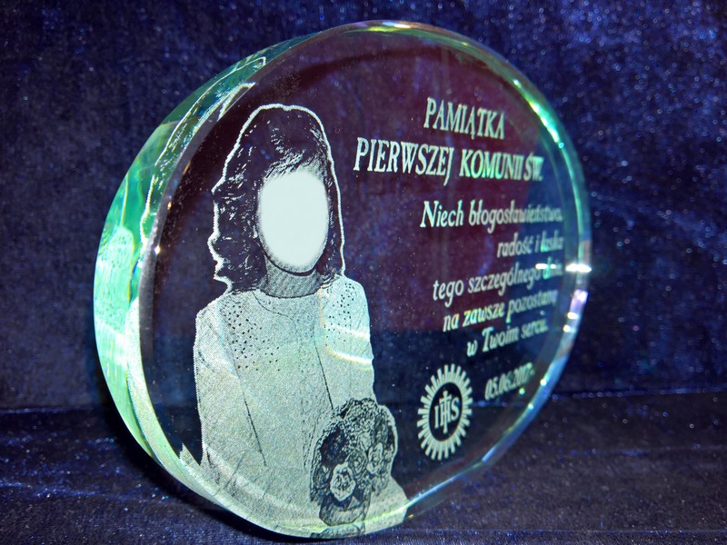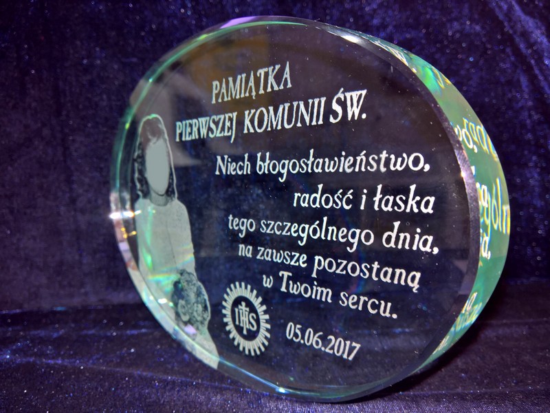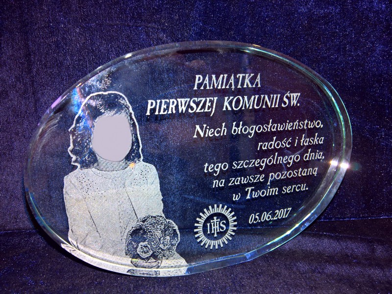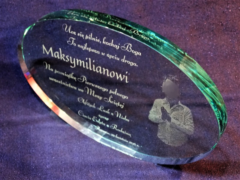 Pamiątka I Komunii Świętej w postaci statuetki szklanej o eliptycznym kształcie wykonanej z grubego szkła, z grawerem dedykacji i ozdobnych grafik.