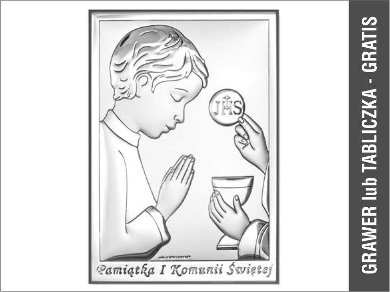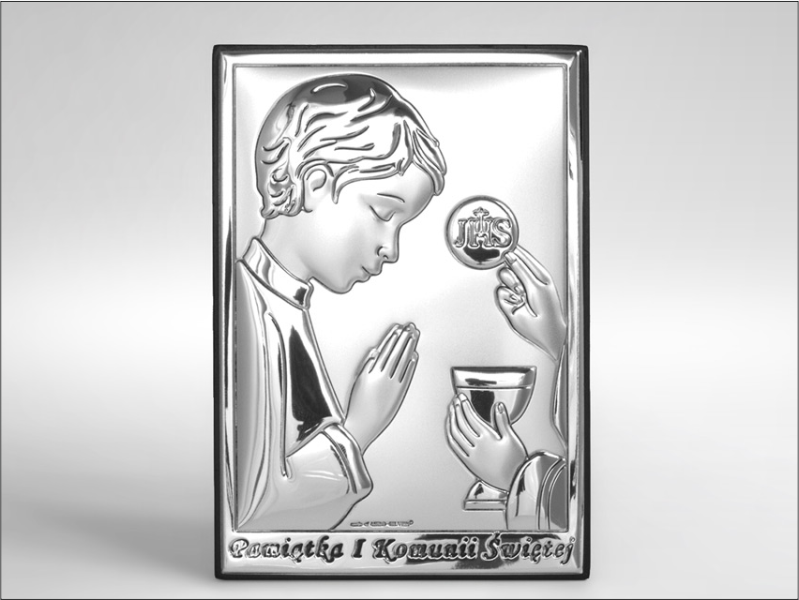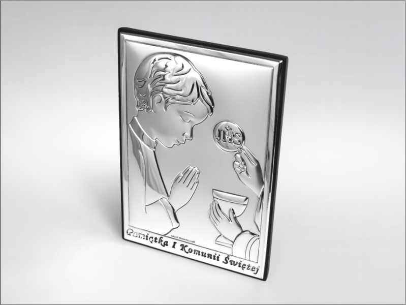 - obrazek srebrny w kształcie prostokąta przedstawiający wizerunek chłopczyka przyjmującego Komunię