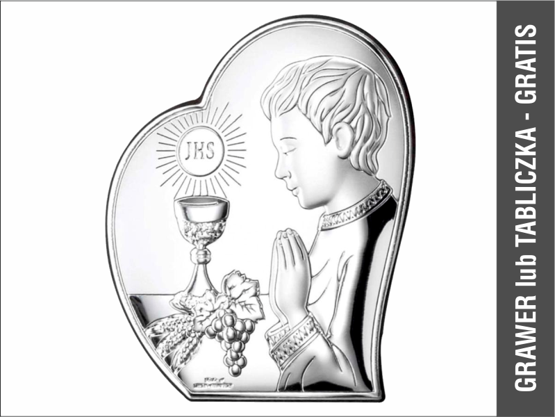 - obrazek srebrny w kształcie serca przedstawiający wizerunek chłopczyka z Hostią i kielichem