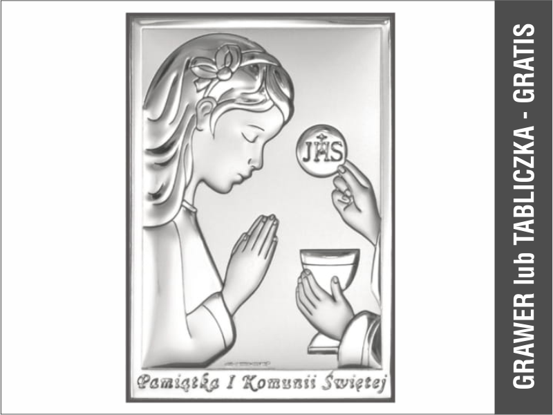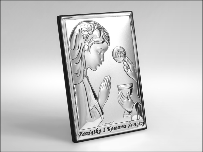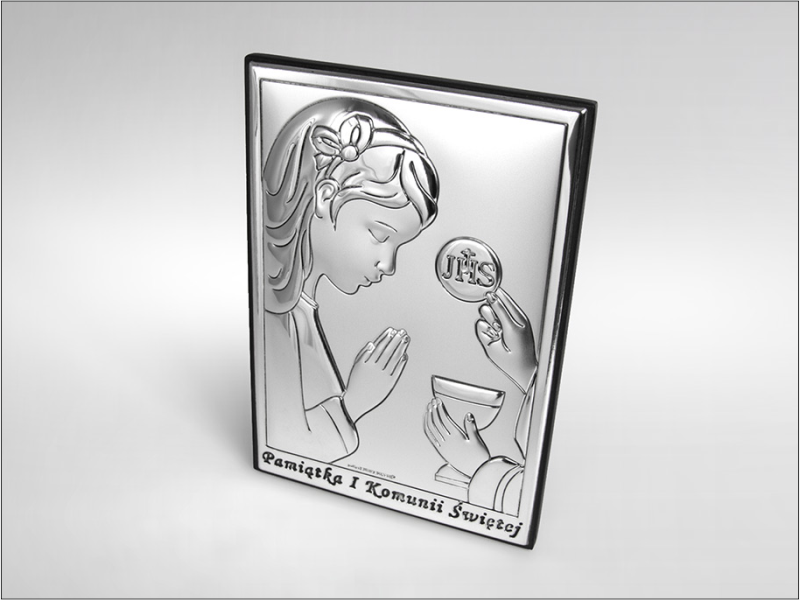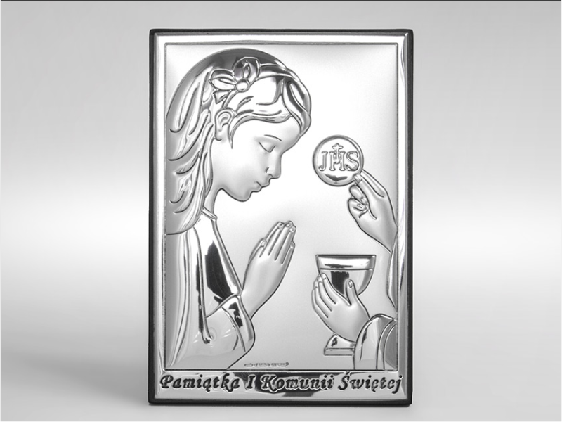 - obrazek srebrny w kształcie prostokąta przedstawiający wizerunek dziewczynki przyjmującej Komunię
