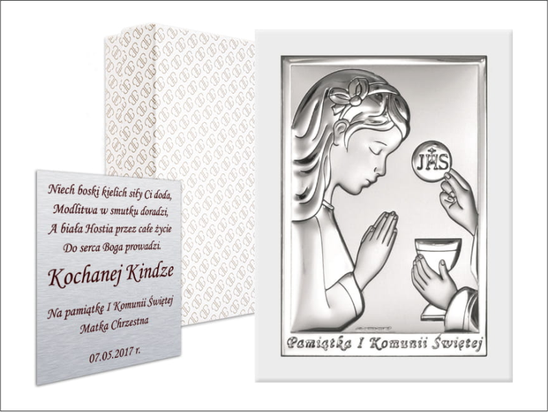 - obrazek srebrny w kształcie prostokąta przedstawiający wizerunek dziewczynki przyjmującej Komunię
