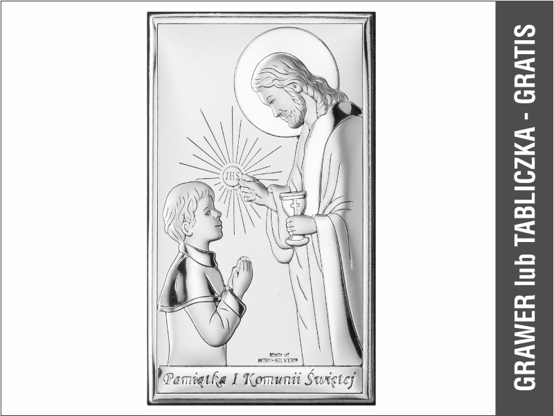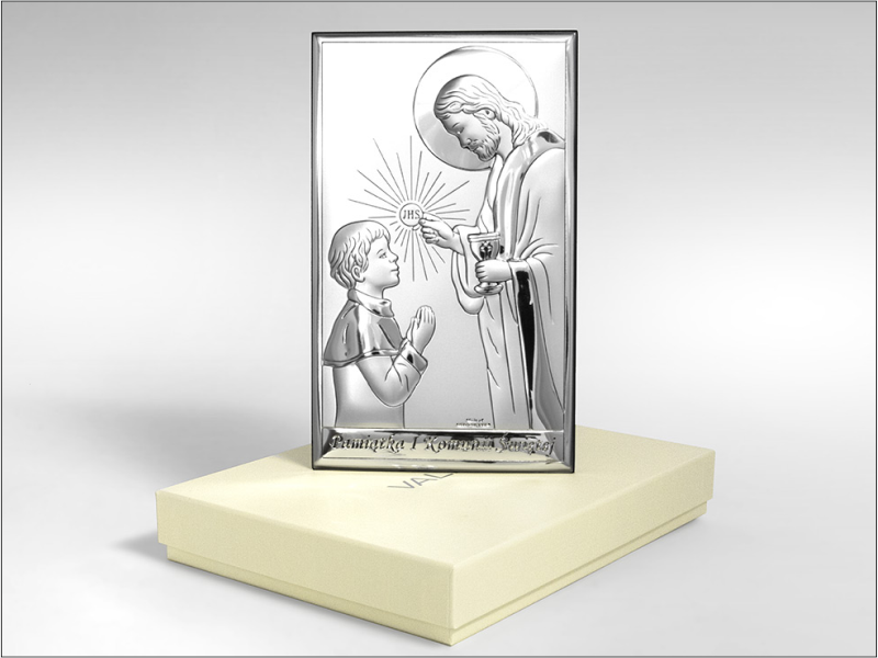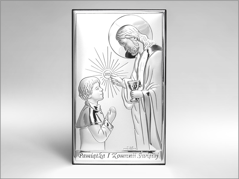 Srebrny Obrazek "Pamiątka I Komunii Św. z Panem Jezusem udzielającym Komunii chłopczykowi prostokątny JAP760".