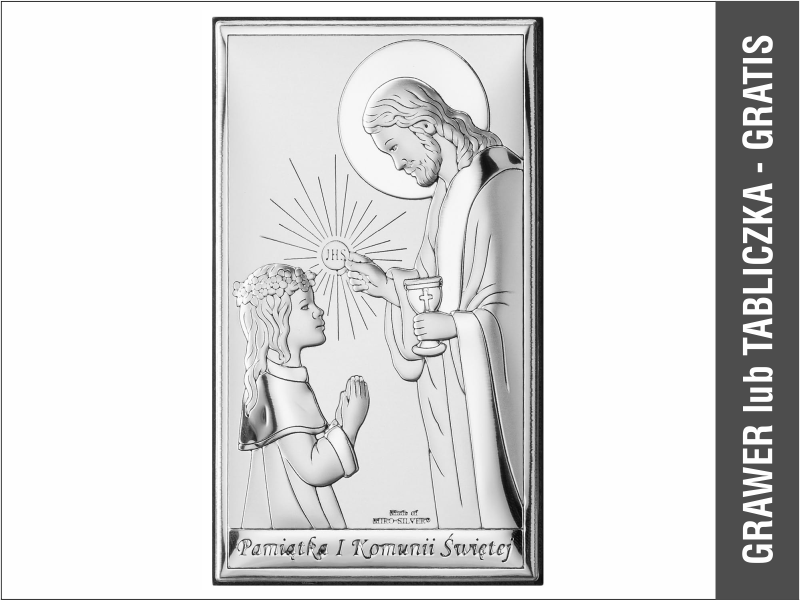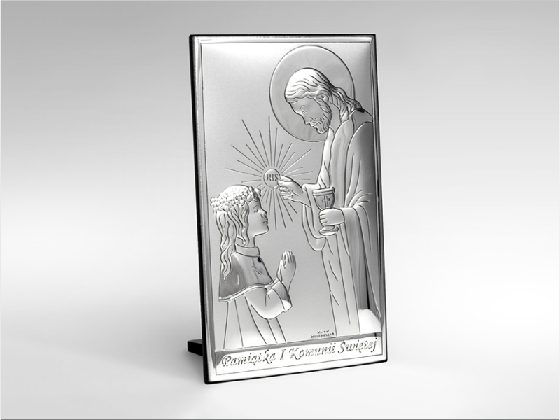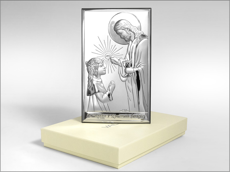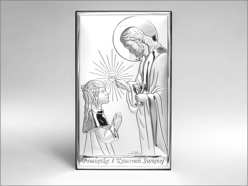 Srebrny Obrazek "Pamiątka I Komunii Św. z Panem Jezusem udzielającym Komunię dziewczynce prostokątny JAP761".