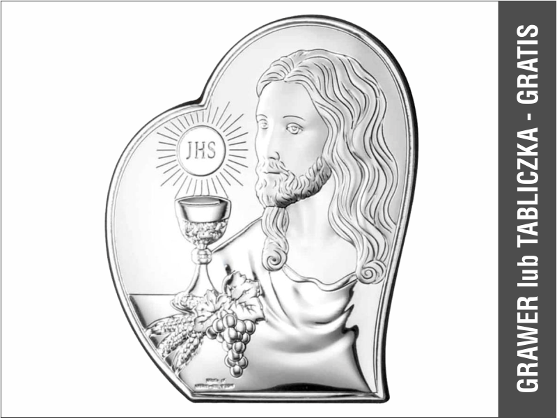 - obrazek srebrny w kształcie serca przedstawiający wizerunek Pana Jezusa z Hostią i kielichem