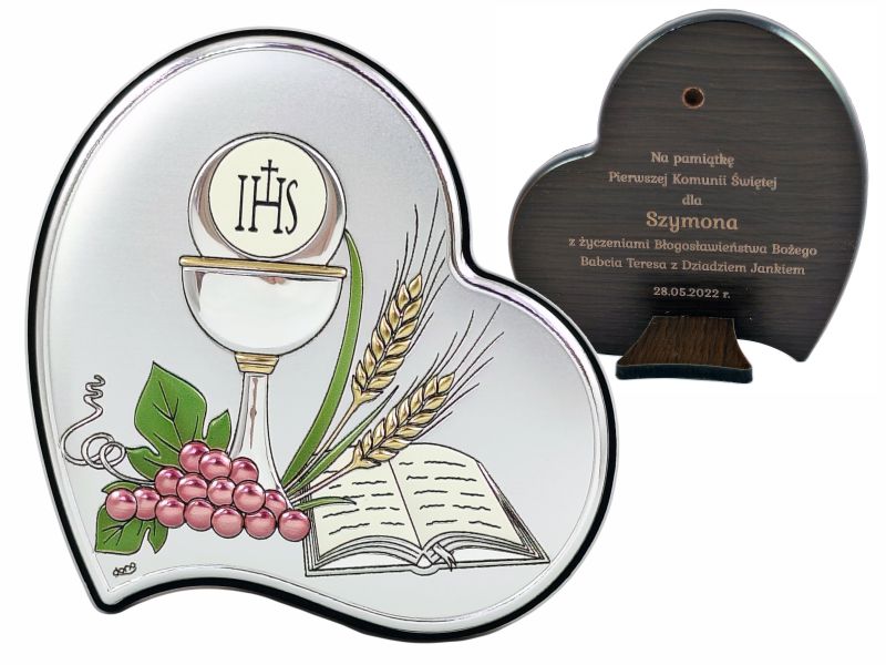Pamiątka Pierwszej Komunii Świętej - srebrny kolorowy obrazek DS53/C w kształcie serca z grawerem.