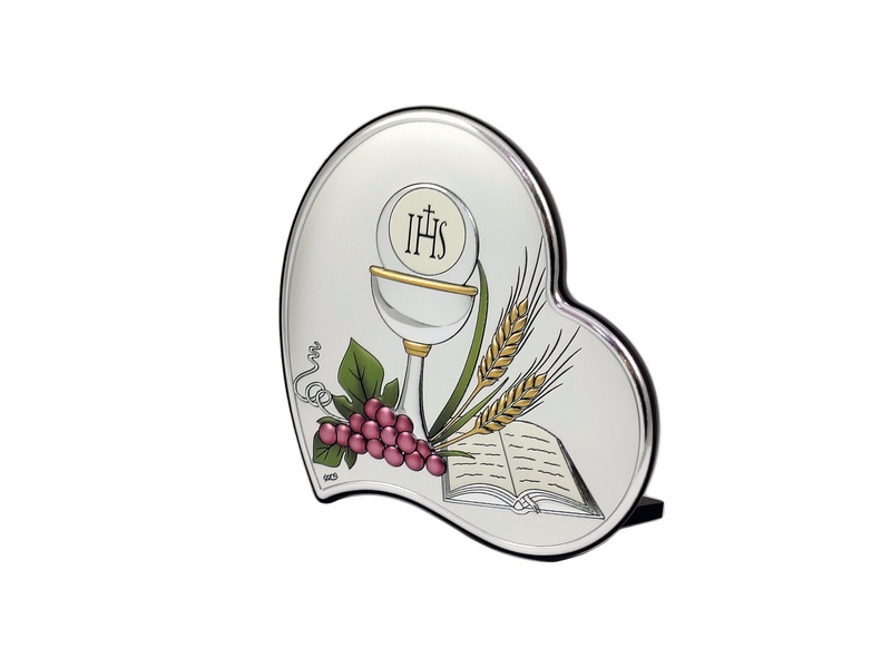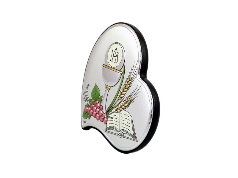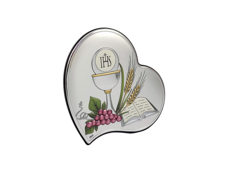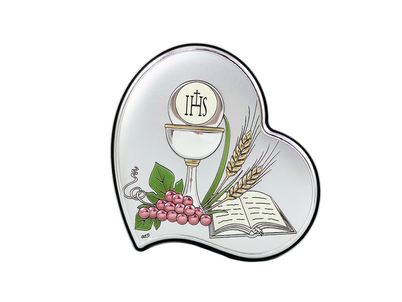 Srebrny obrazek DS53/C w wersji kolorowej, ma kształt serca i przedstawia wizerunek kielicha z hostią, winorośl i Pismo Święte.