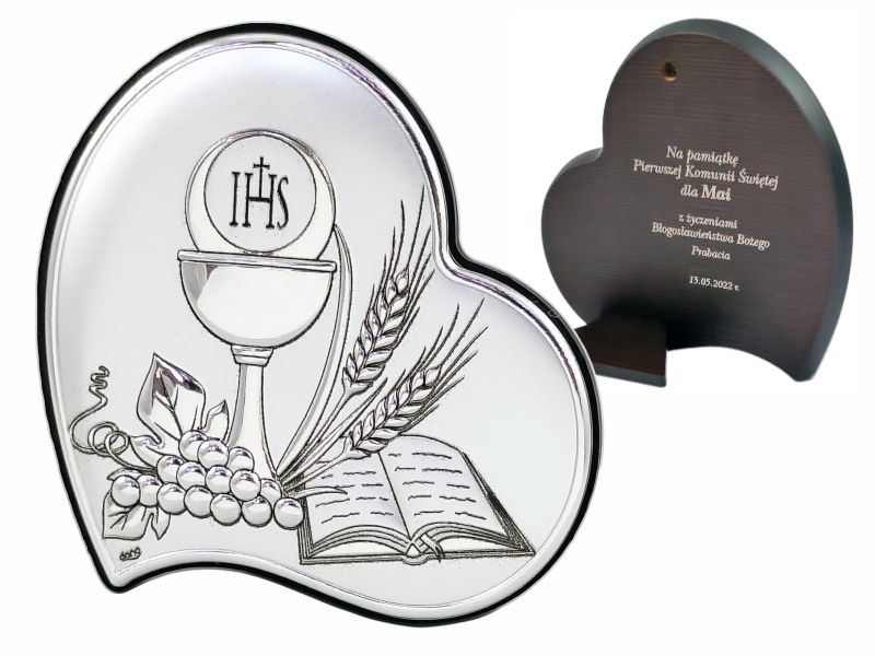 Pamiątka Pierwszej Komunii Świętej - srebrny obrazek DS53 w kształcie serca z grawerem.