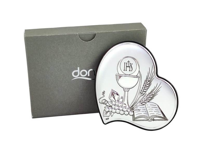 Srebrny obrazek DS53 ma kształt serca i przedstawia wizerunek kielicha z hostią oraz kłosy zboża, winogrona i Pismo Święte.