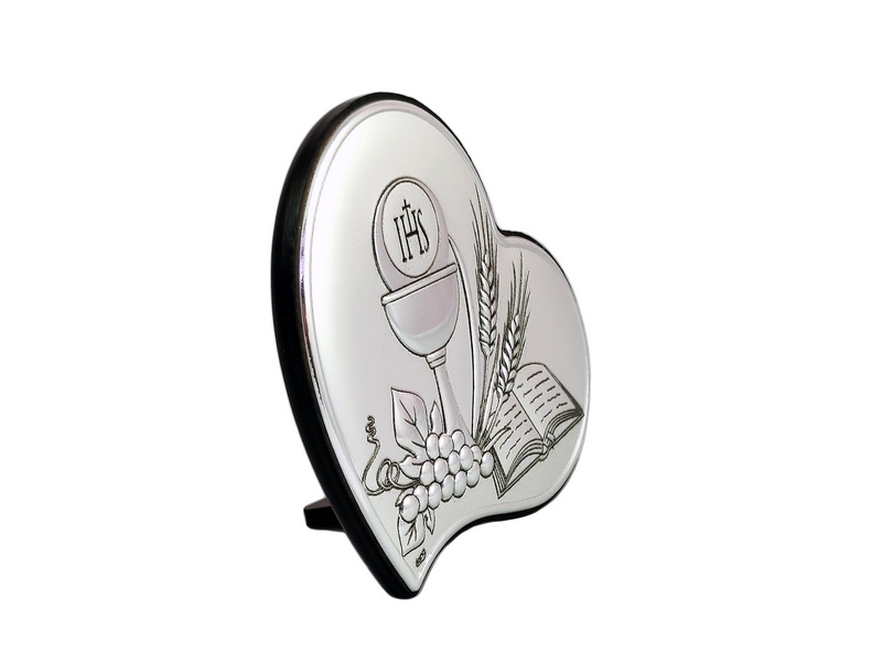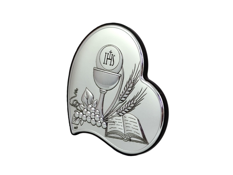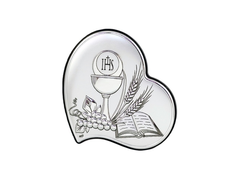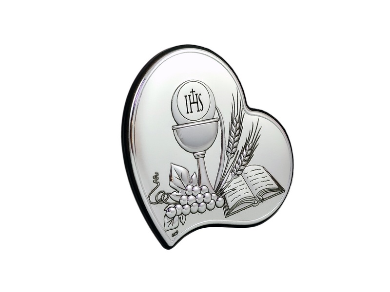 - srebrny obrazek w kształcie serca z kielichem i hostią