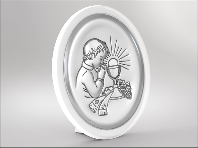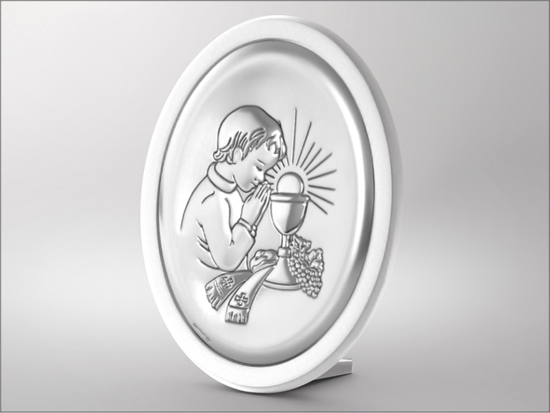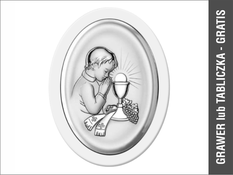 Srebrny Obrazek "Pamiątka I Komunii Św. dla chłopczyka owalna na drewnie 6342O".