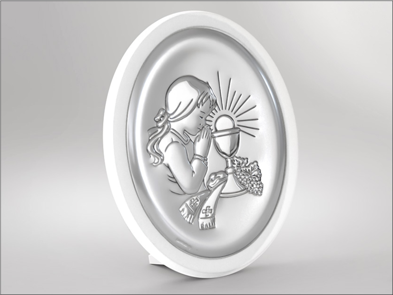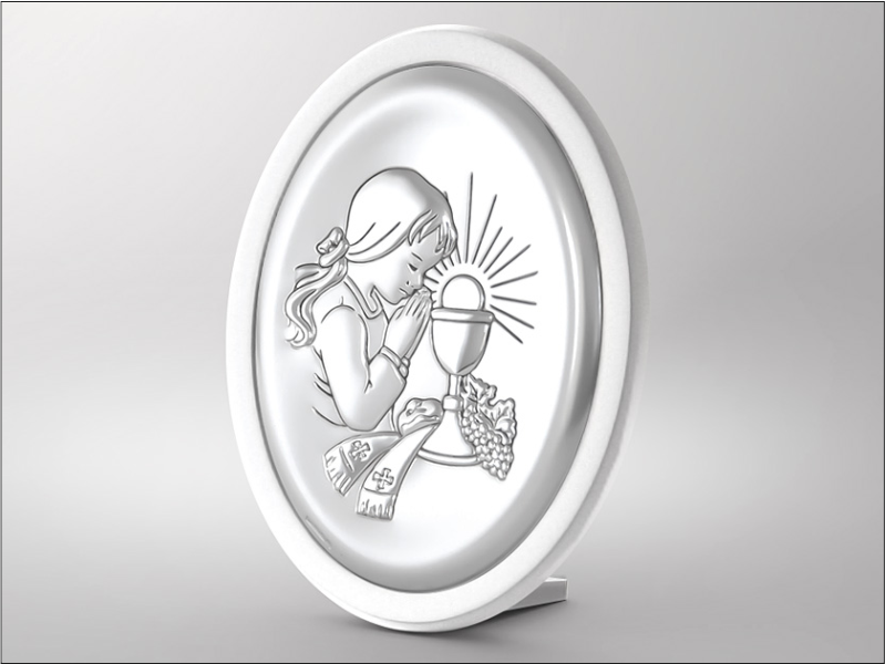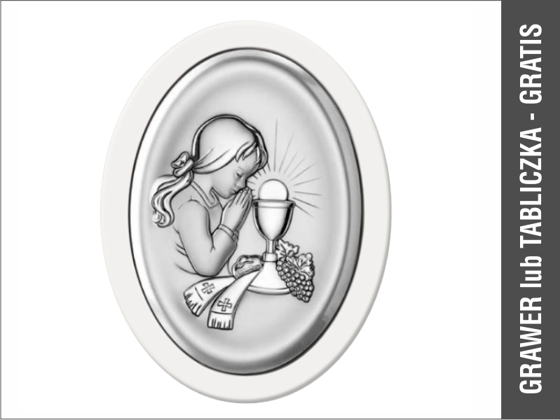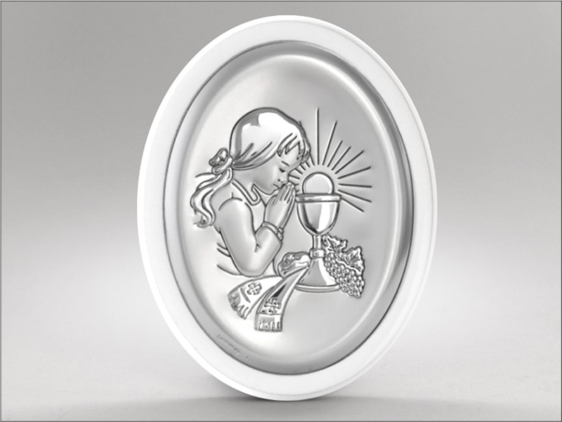 Srebrny Obrazek "Pamiątka I Komunii Św. dla dziewczynki owalna na drewnie 6342AW".