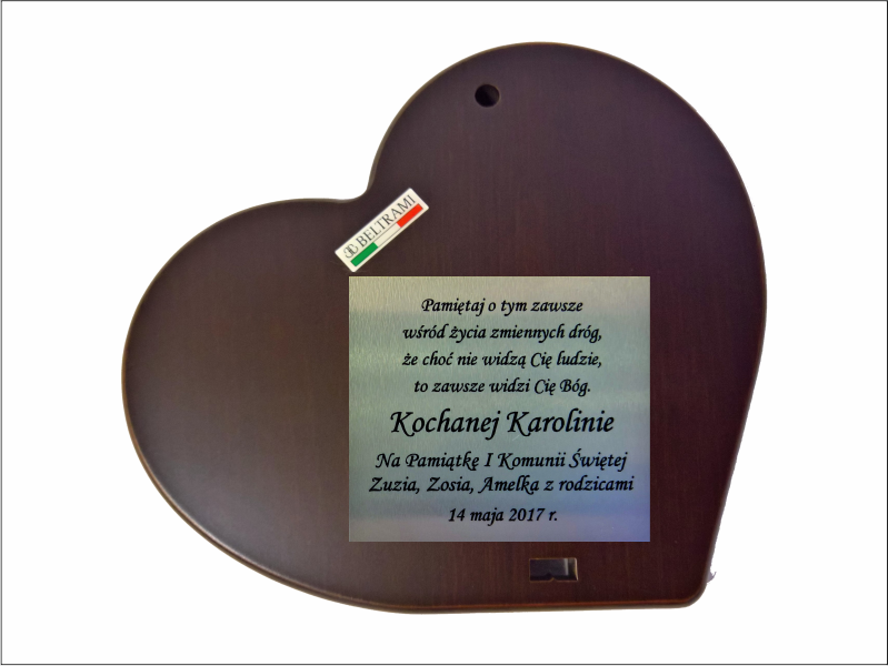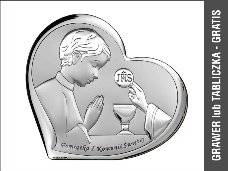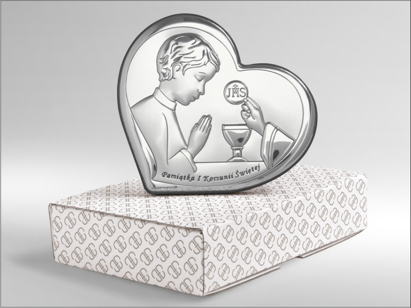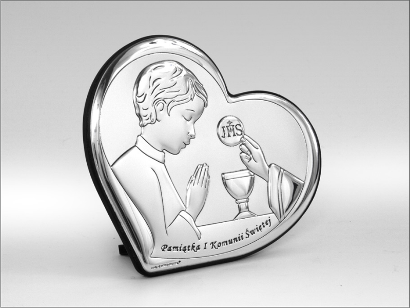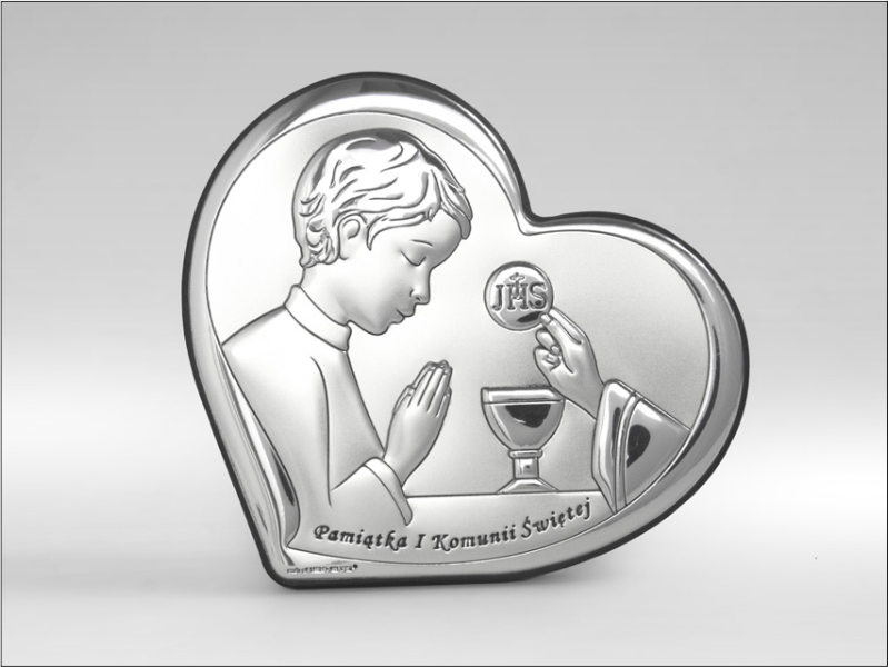 - obrazek srebrny w kształcie serca przedstawiający wizerunek chłopca przystępującego do Komunii Św.