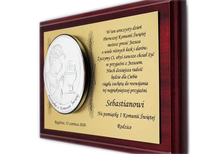 Pamiątkowa dedykacja wygrawerowana jest w złotym laminacie grawerskim, na którym umieszczony jest srebrny obrazek.