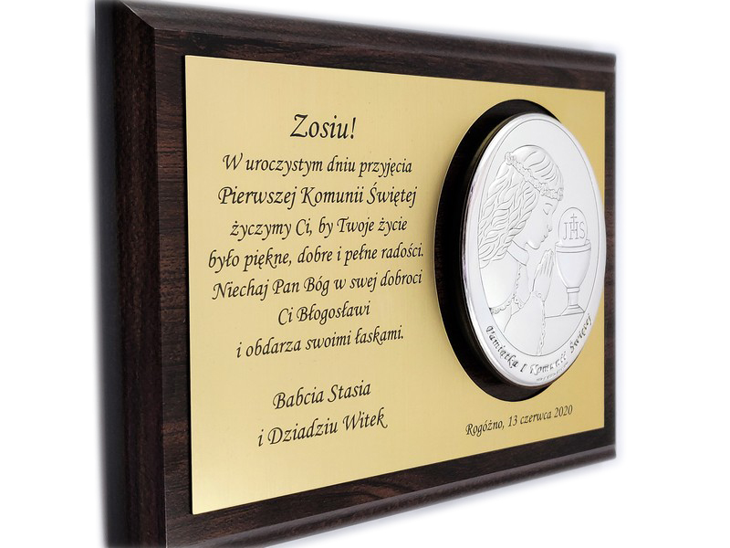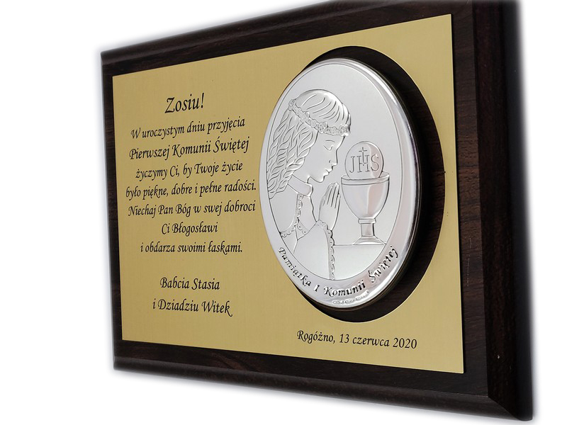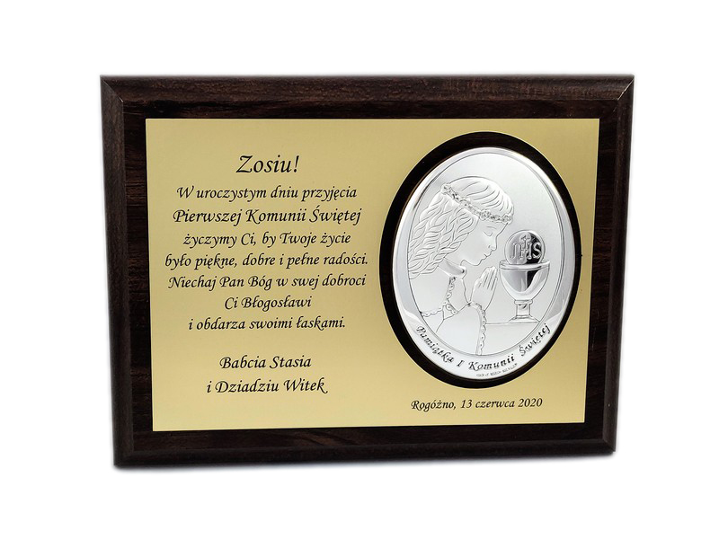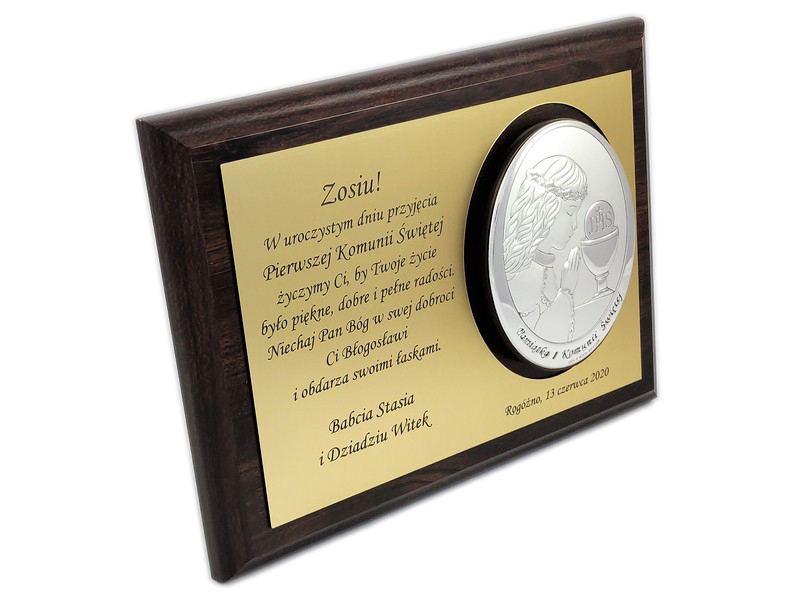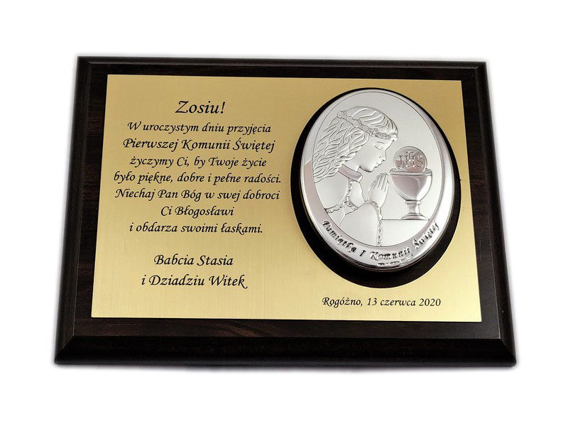 - ze złotego laminatu z wygrawerowaną dedykacją,