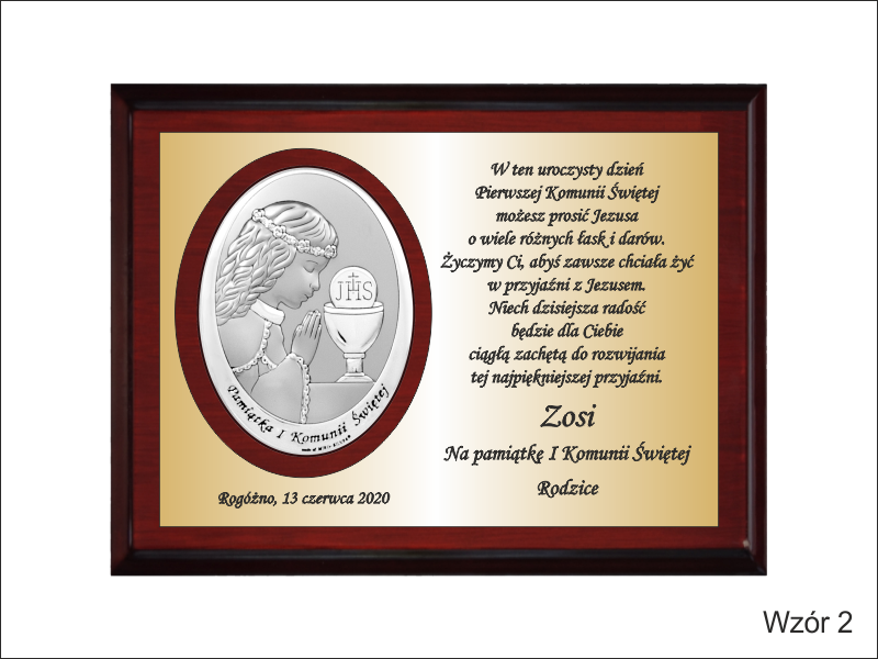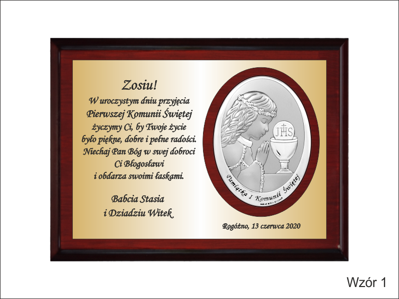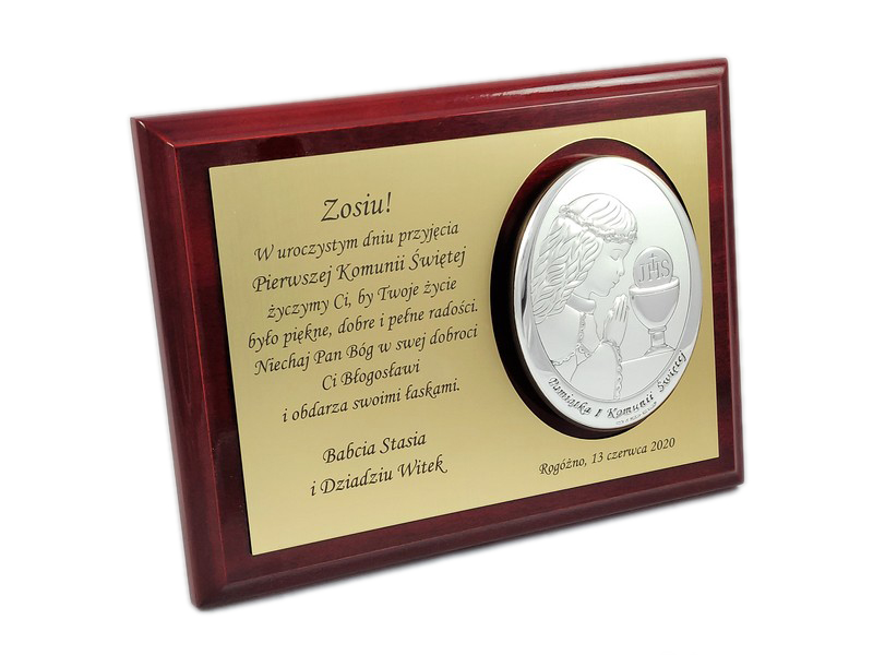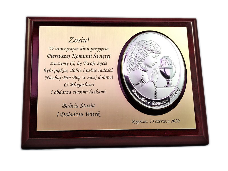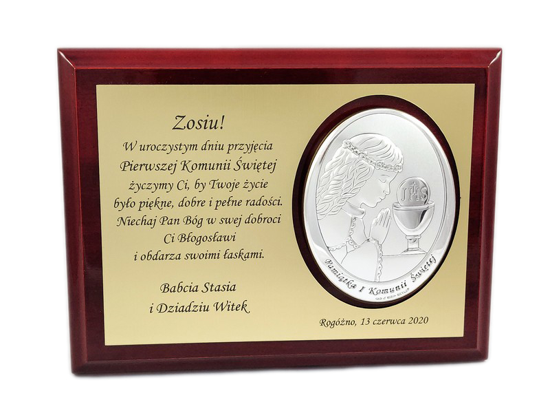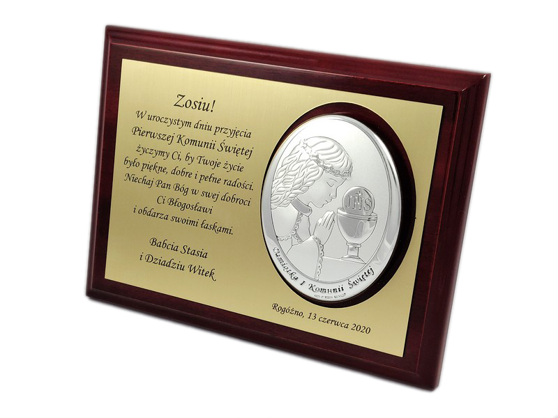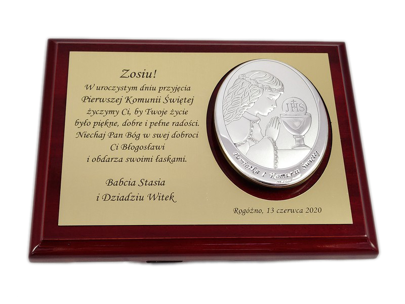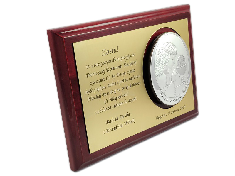 Pamiątkowa dedykacja wygrawerowana jest w złotym laminacie grawerskim, w którym dodatkowo wycięte jest miejsce na srebrny obrazek.