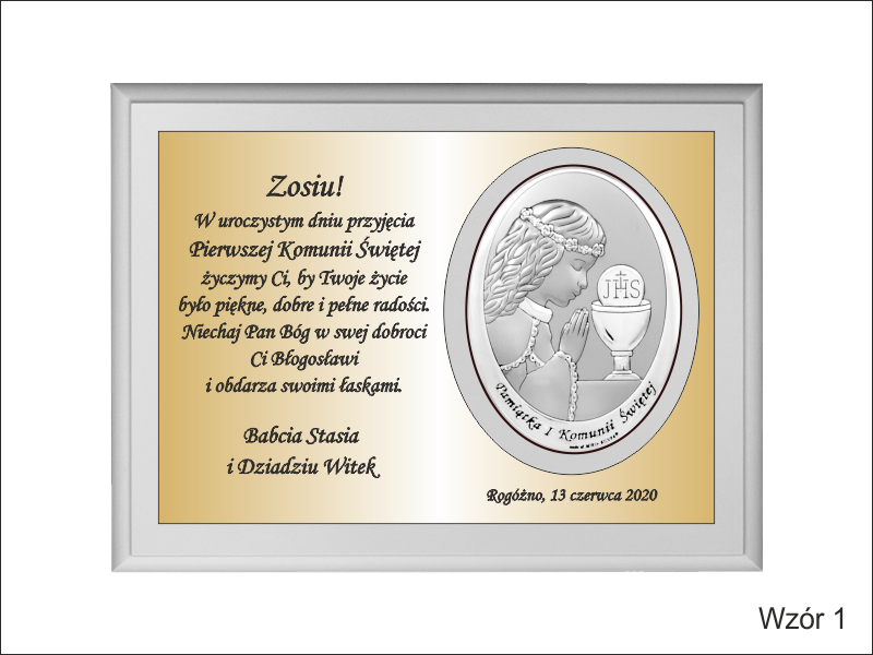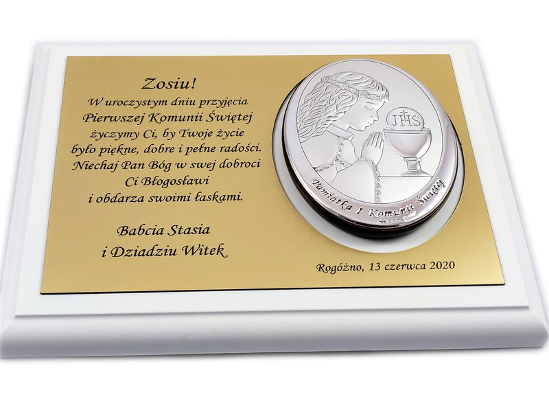 Pamiątkowa dedykacja wygrawerowana jest w złotym laminacie grawerskim, w którym dodatkowo wycięte jest miejsce na srebrny obrazek.