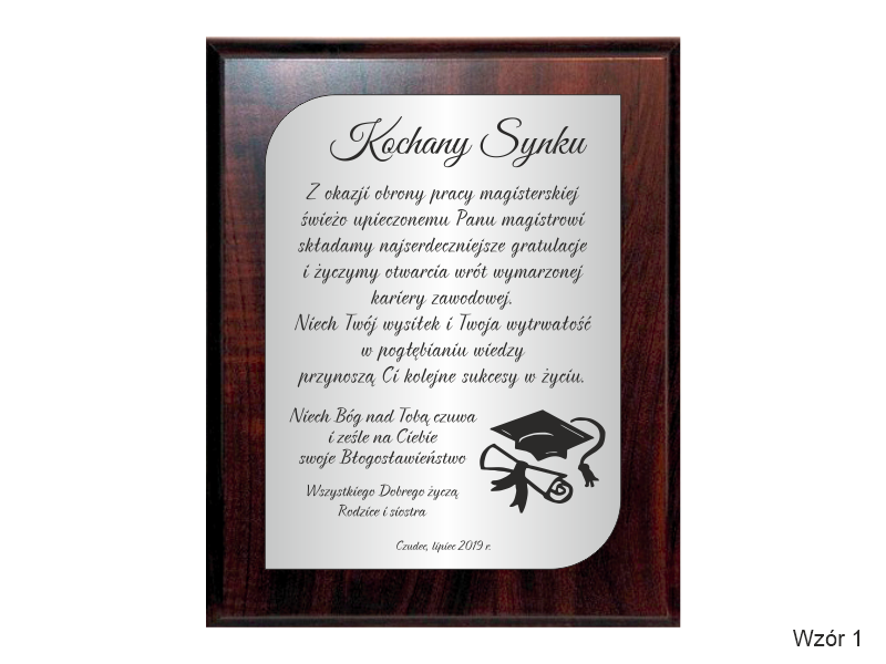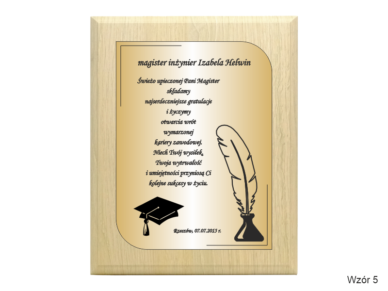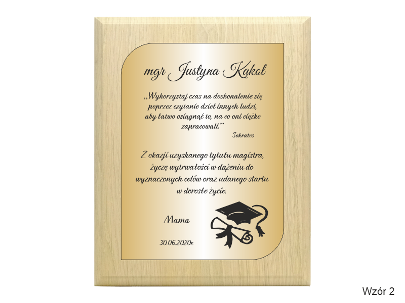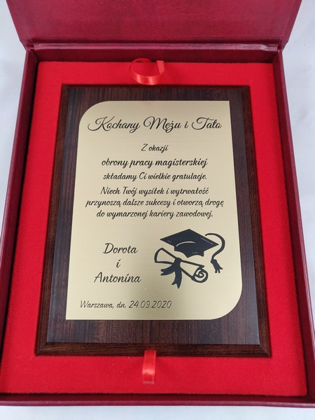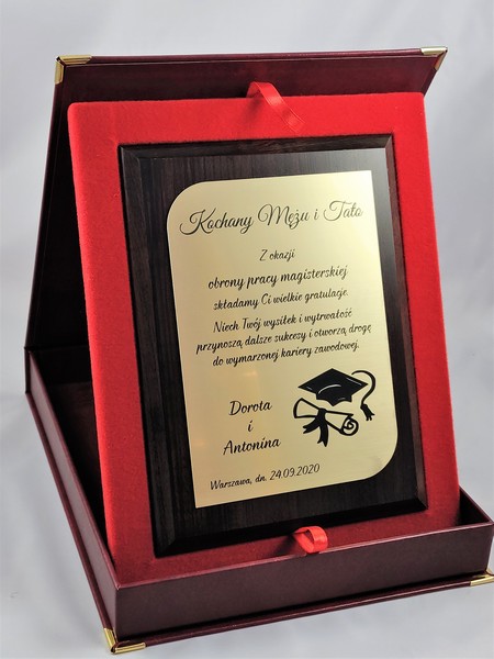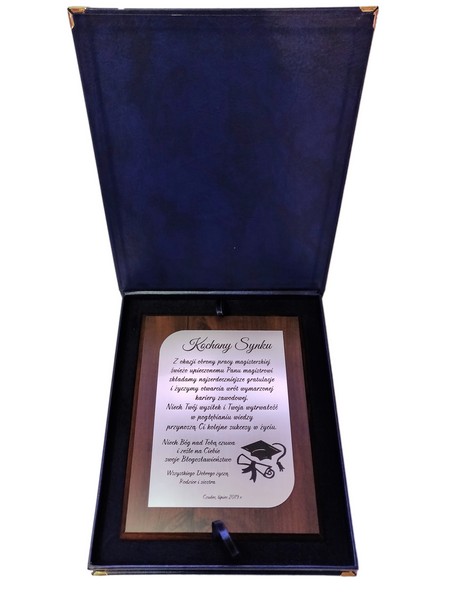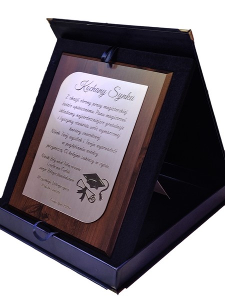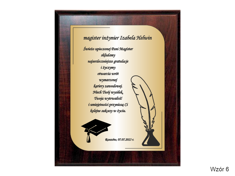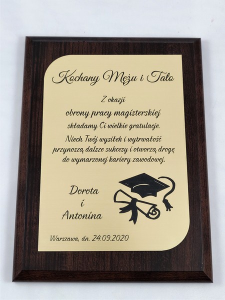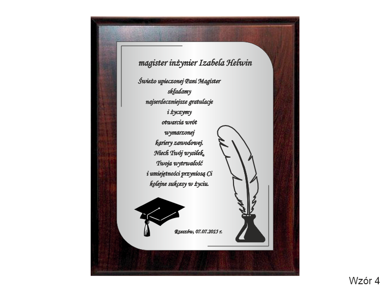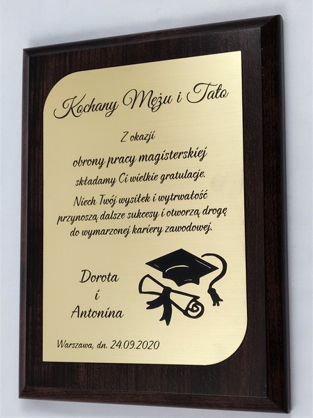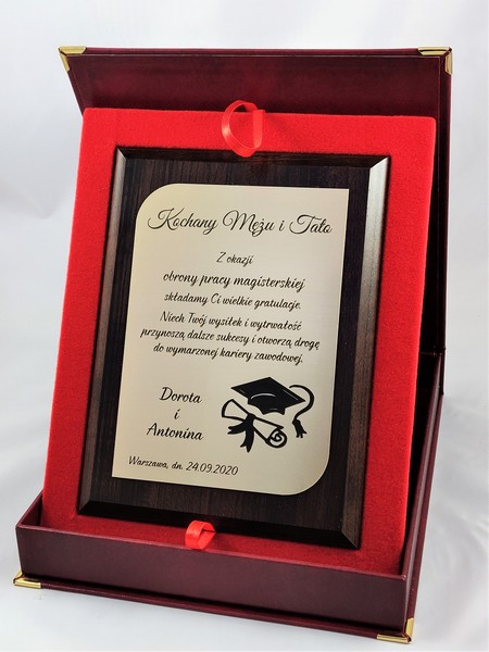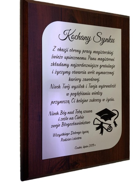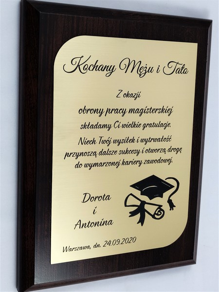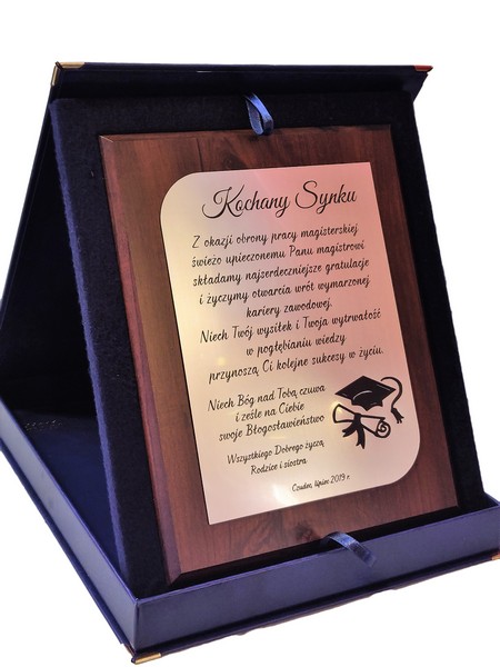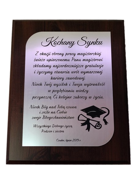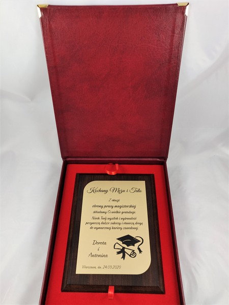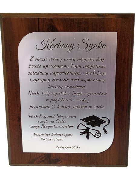 Gratulacje dla Absolwenta - Magistra czy Inżyniera w postaci drewnianego dyplomu okolicznościowego z grawerem.