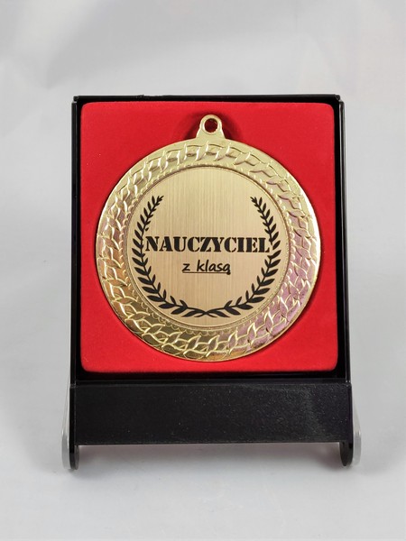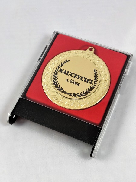 Upominek dla Nauczyciela w postaci metalowego dużego medalu z dedykacją.