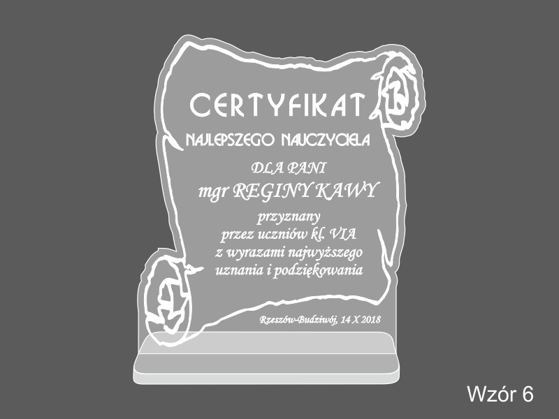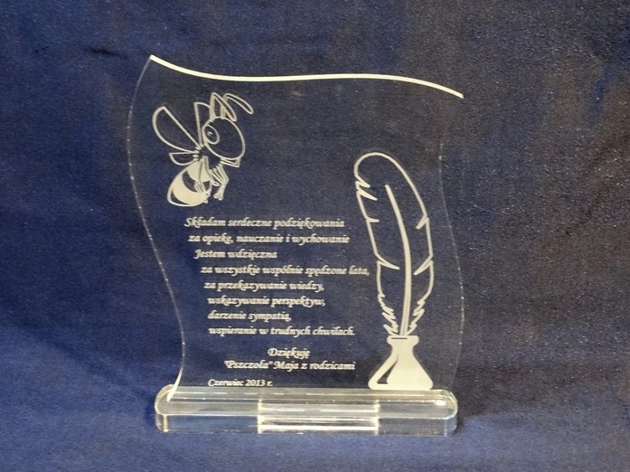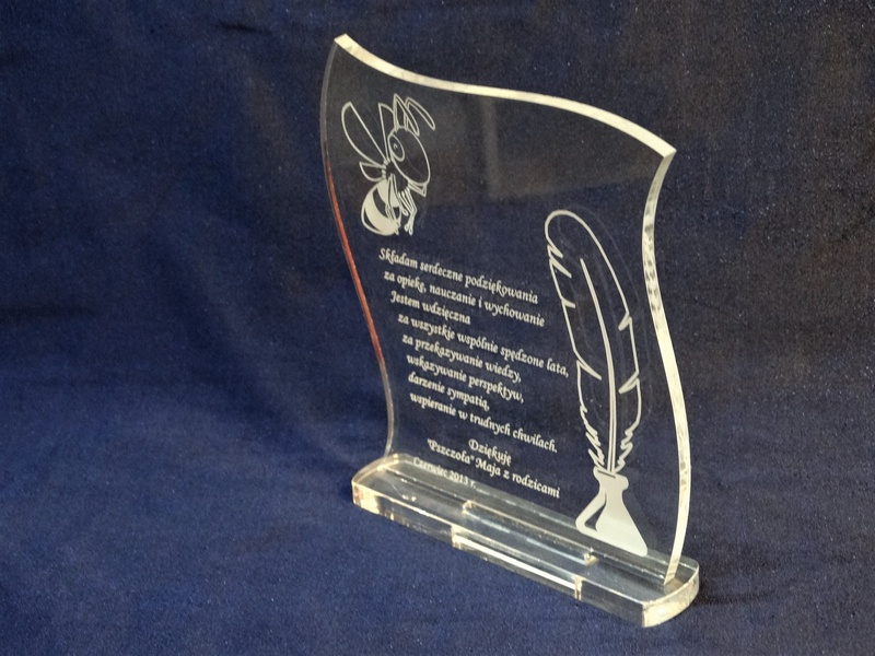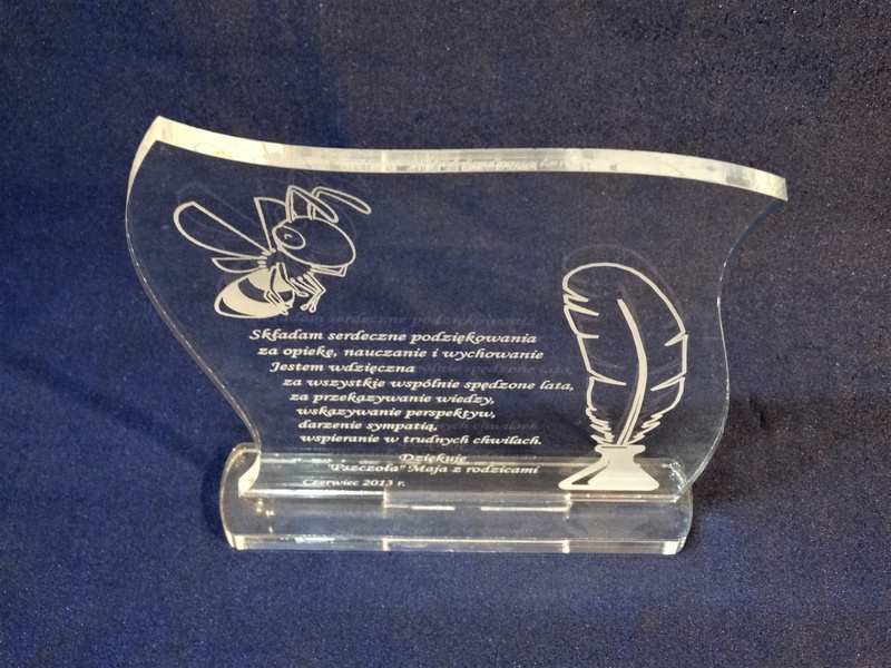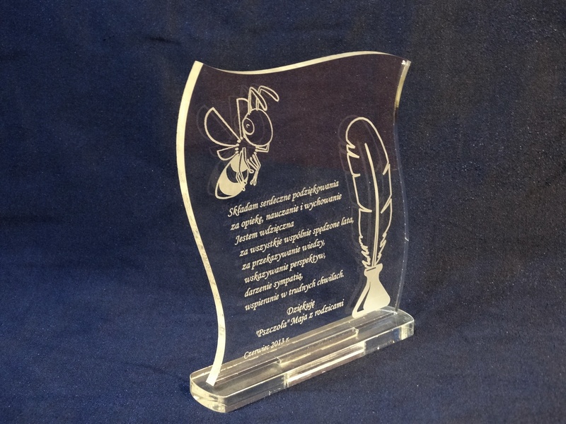 Pamiątkowa statuetka dla Nauczyciela wykonana z bezbarwnej pleksi, z grawerem dedykacji i ozdobnych grafik.