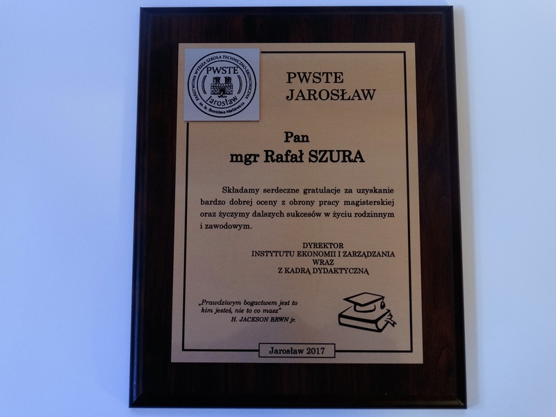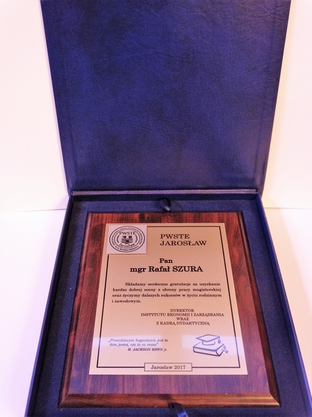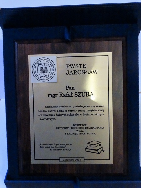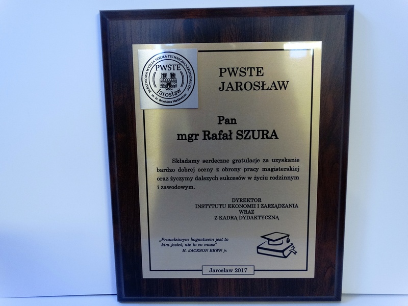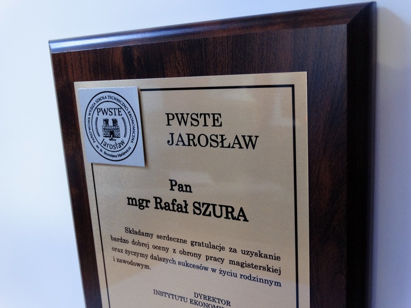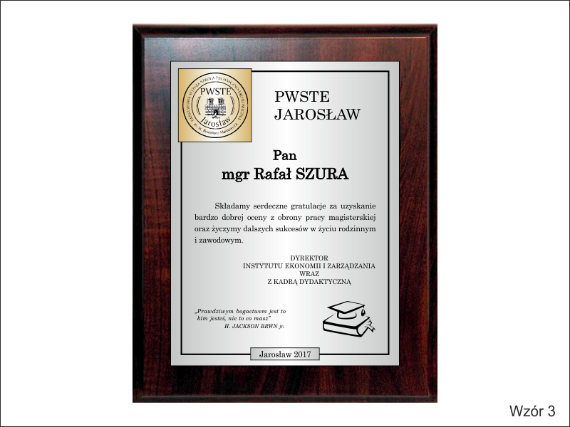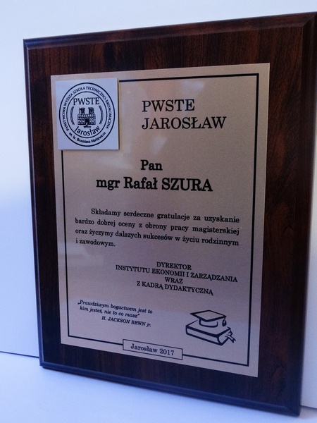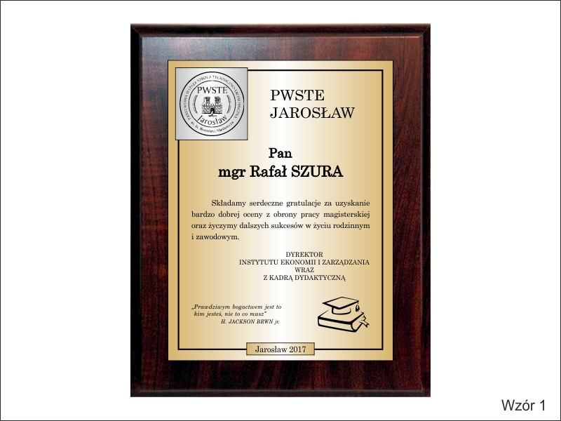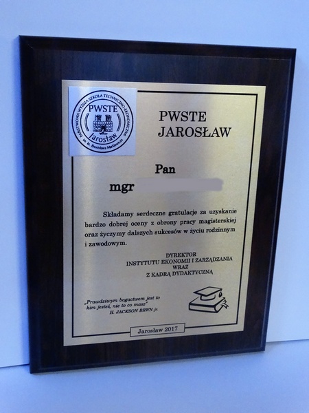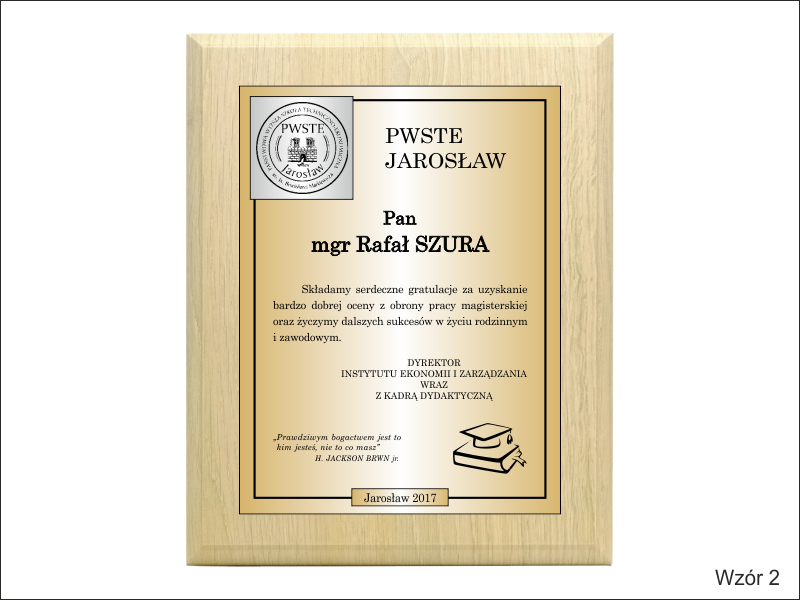 Gratulacje dla Magistra - Absolwenta uczelni w postaci drewnianego dyplomu okolicznościowego z nadrukiem.