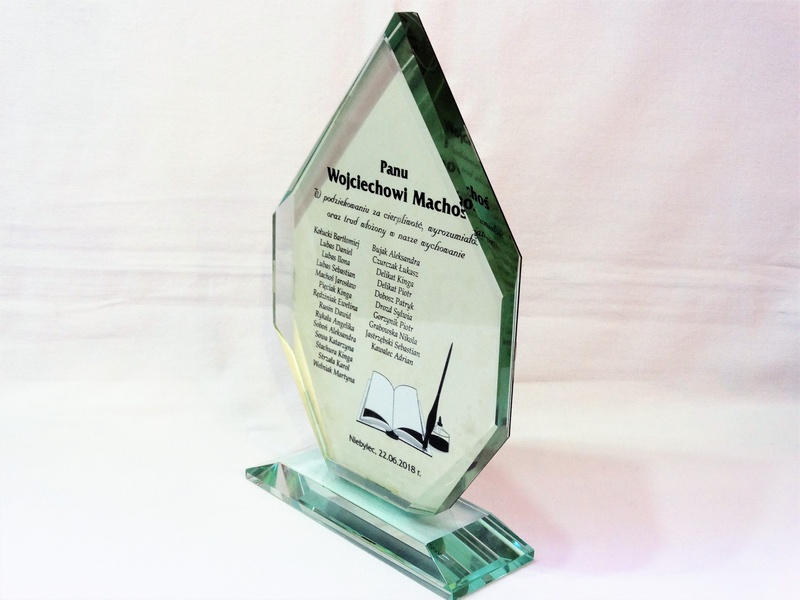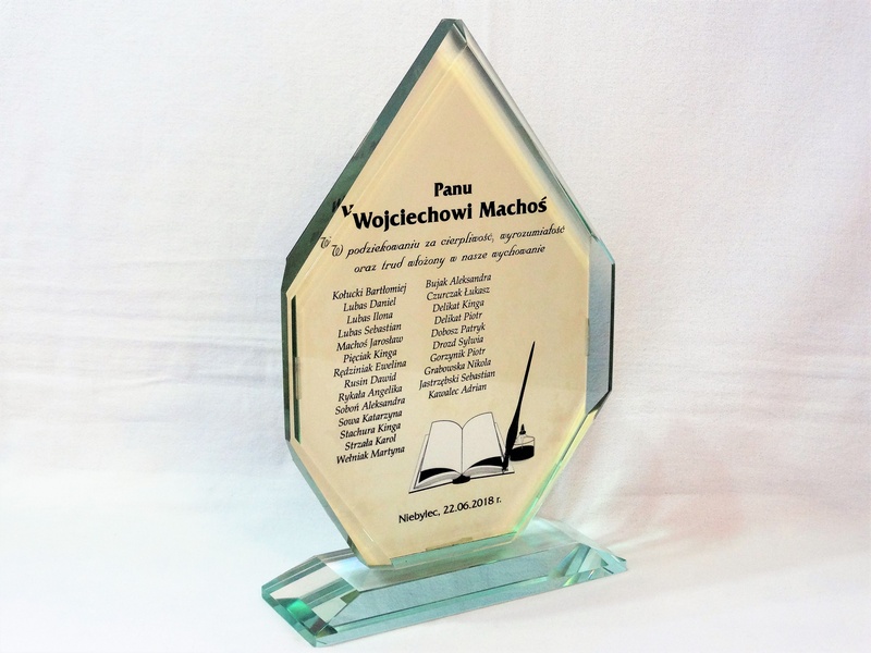 Pamiątkowa statuetka szklana G018 dla Nauczyciela z grubego szlifowanego szkła z nadrukiem dedykacji i ozdobnych grafik.