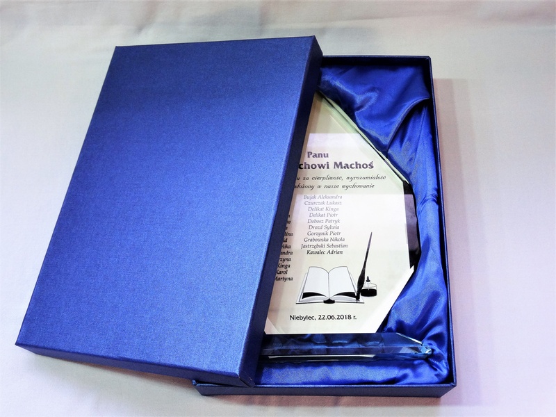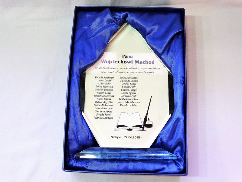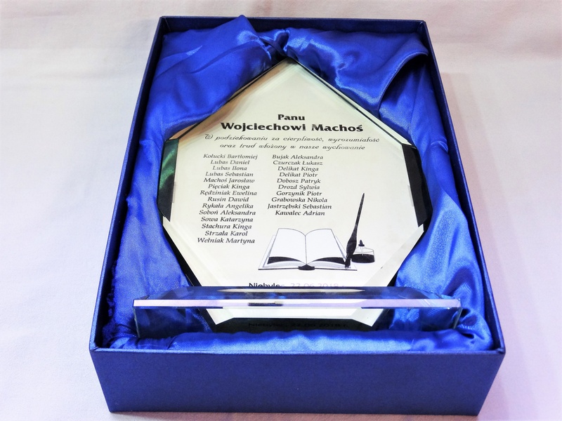 Prezentowana pamiątkowa statuetka dedykowana jest dla Nauczyciela, ale można wykonać ją także na inne okazje.Pamiątkowy nadruk dla Nauczyciela można także wykonać na innych modelach szklanych statuetek.