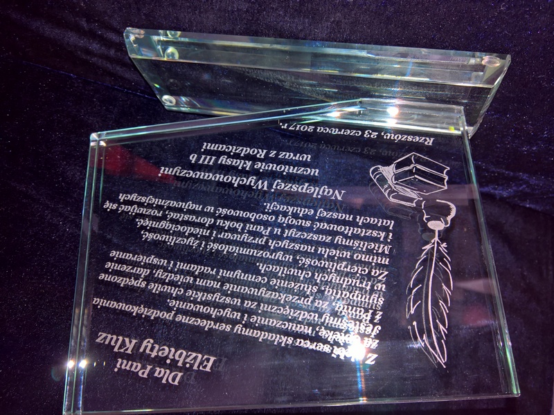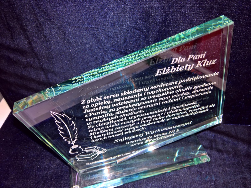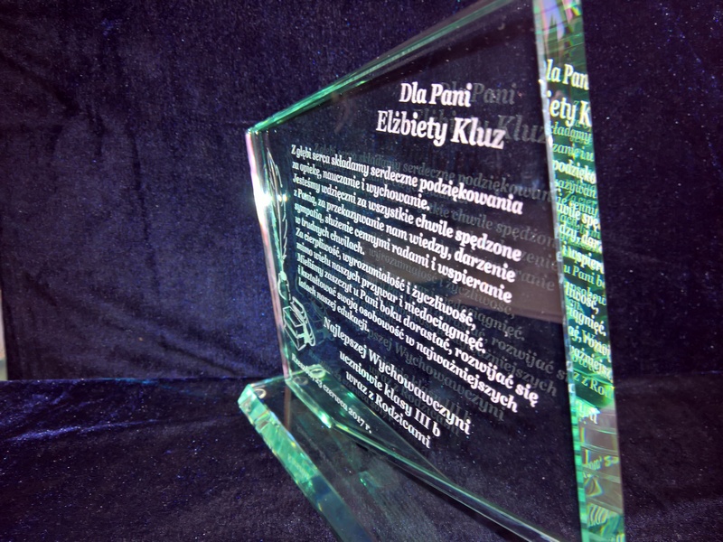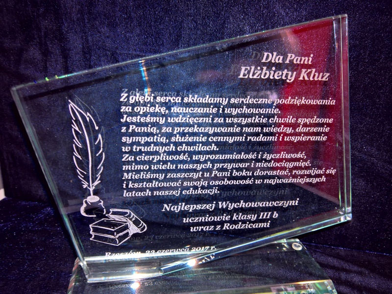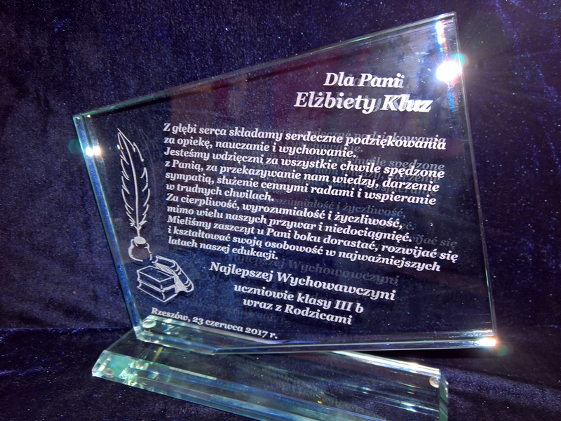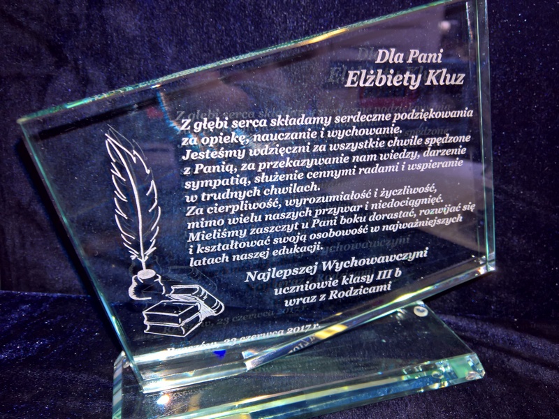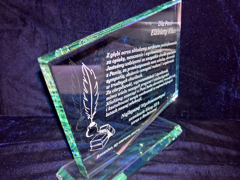 Pamiątkowy grawer dla Nauczyciela można także wykonać na innych modelach szklanych statuetek.