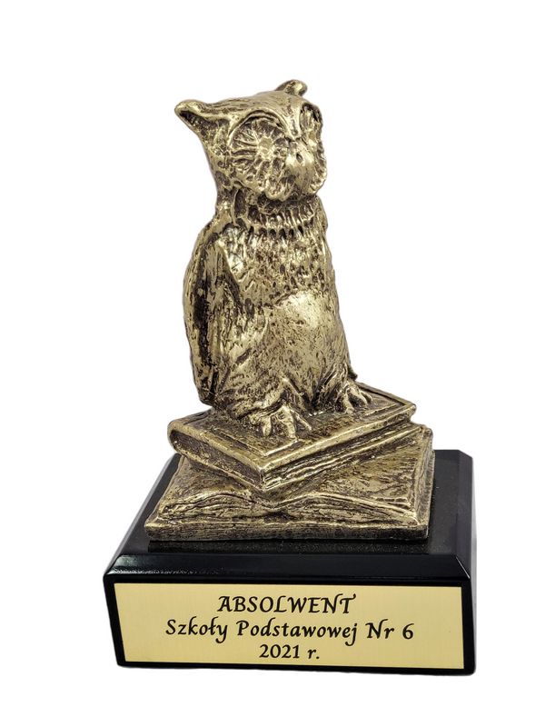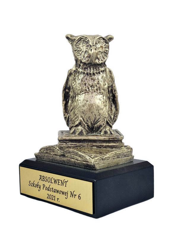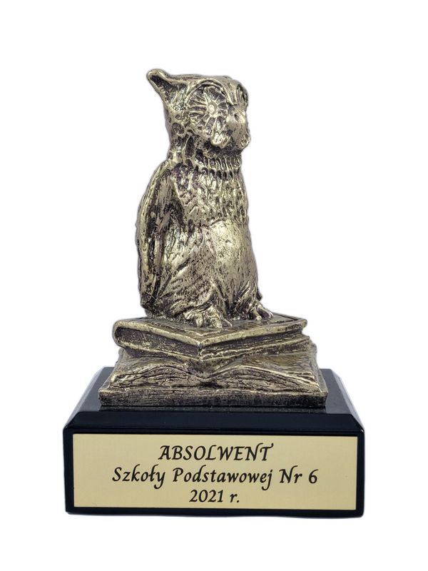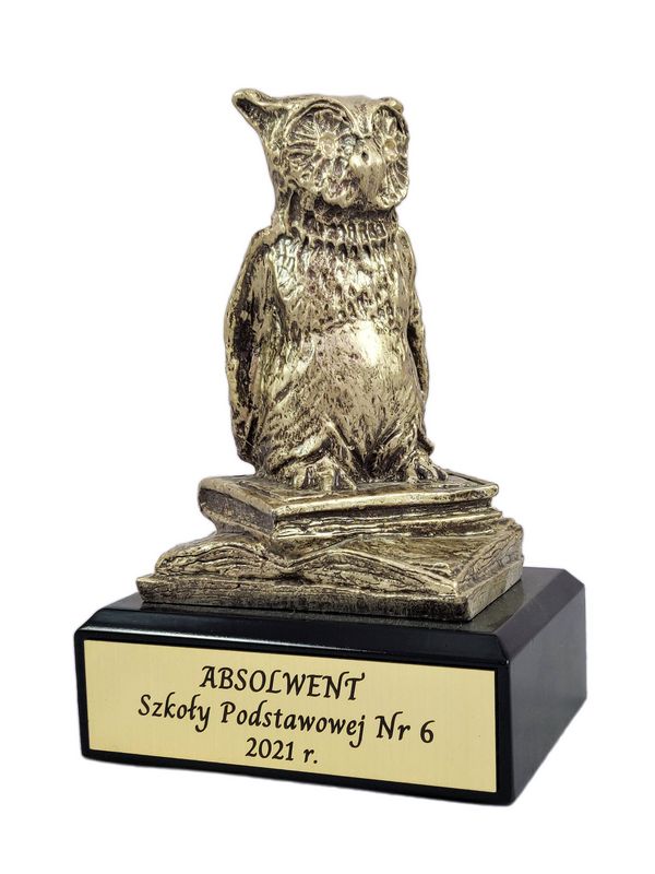 Pamiątka ukończenia szkoły dla absolwenta w postaci statuetki odlewanej przedstawiającej "Mądrą Sową" z grawerem.