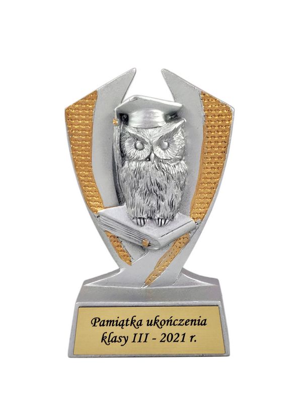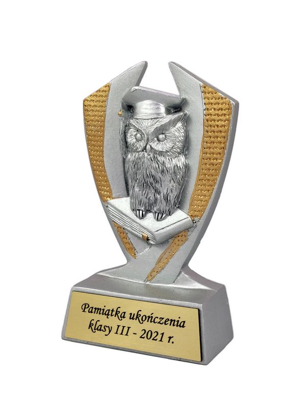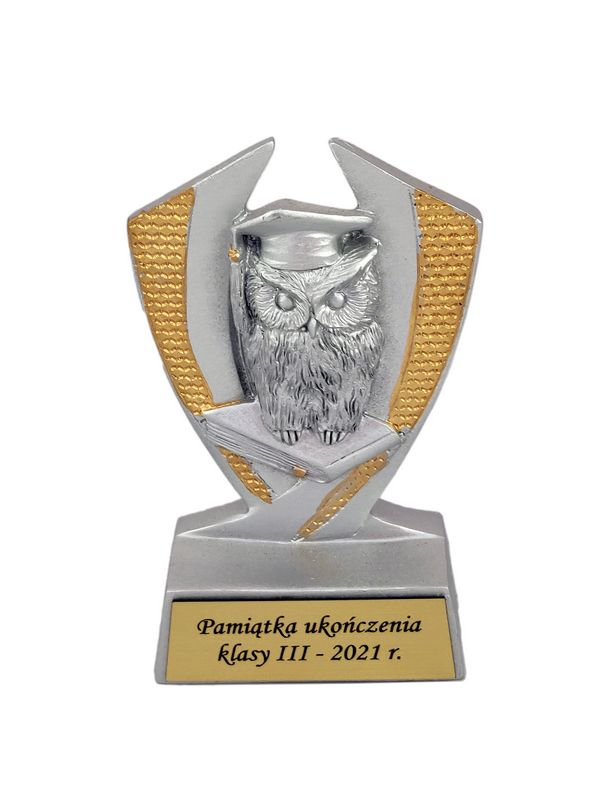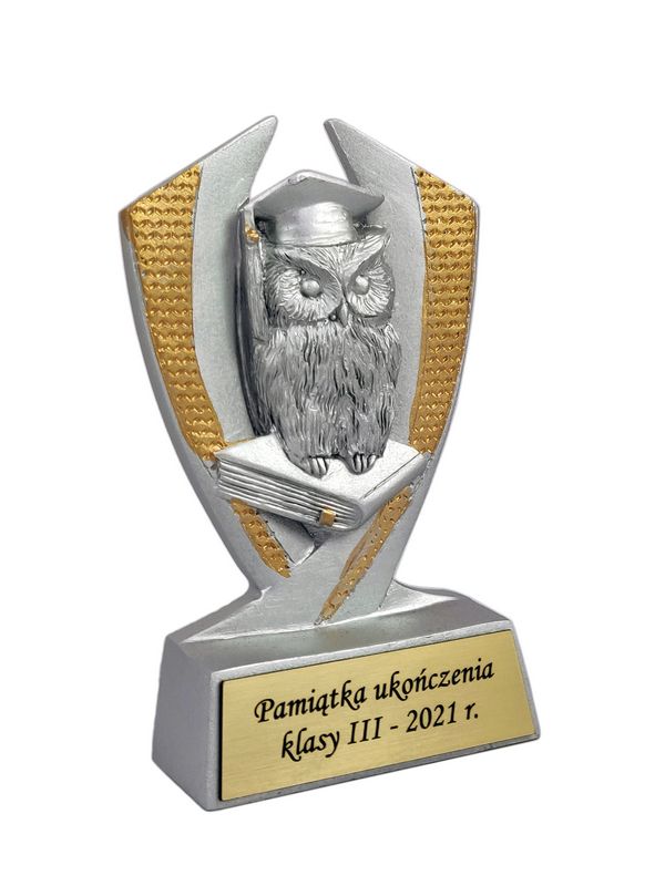 Pamiątka ukończenia szkoły w formie niewielkiej odlewanej statuetki przedstawiającej "Mądrą Sową" z grawerem.