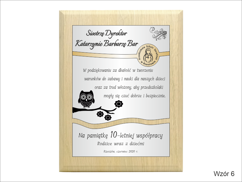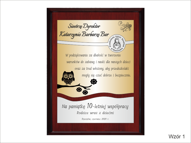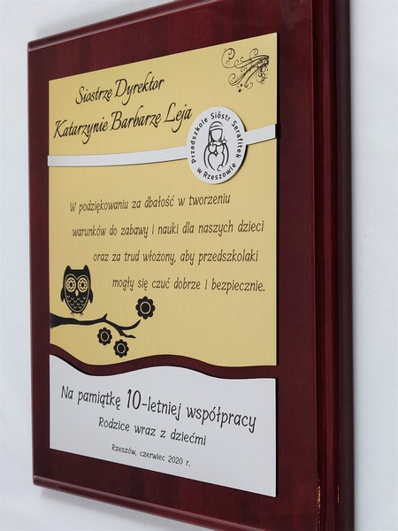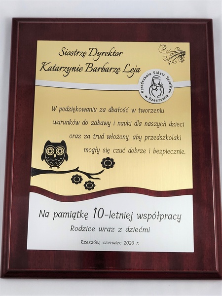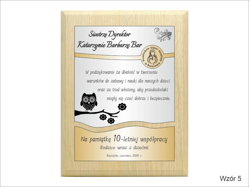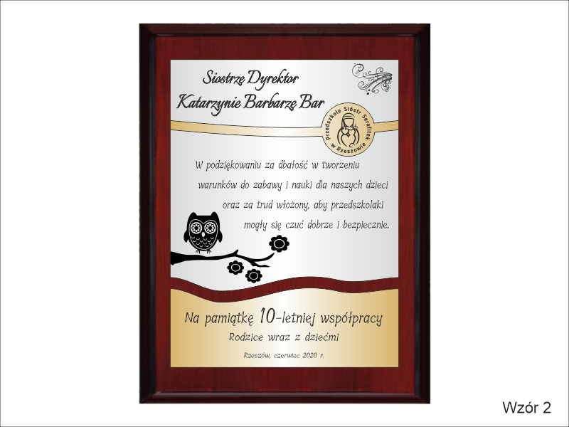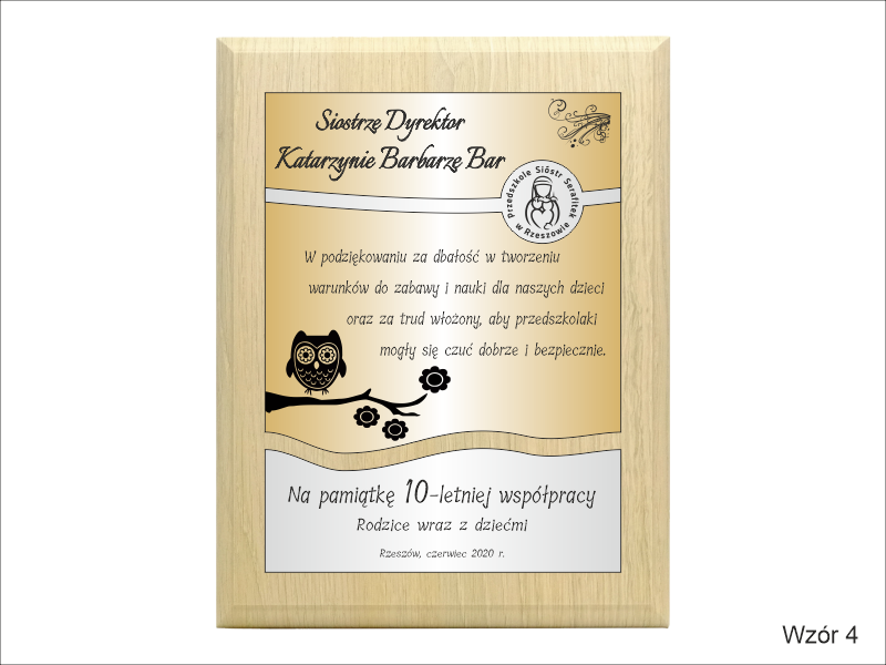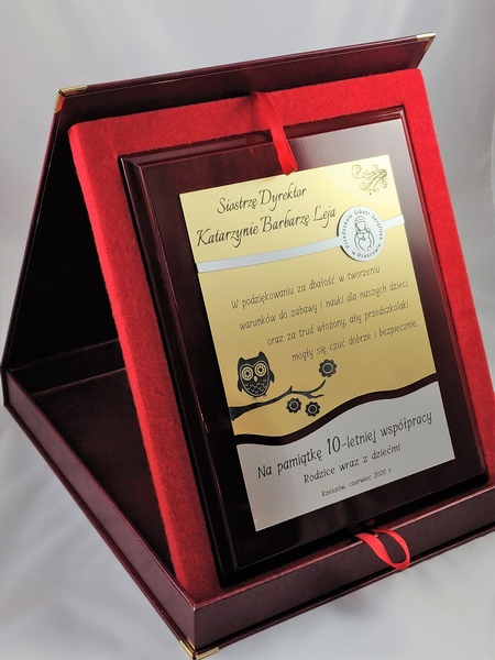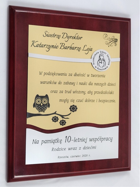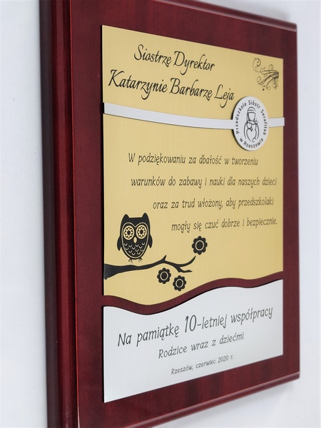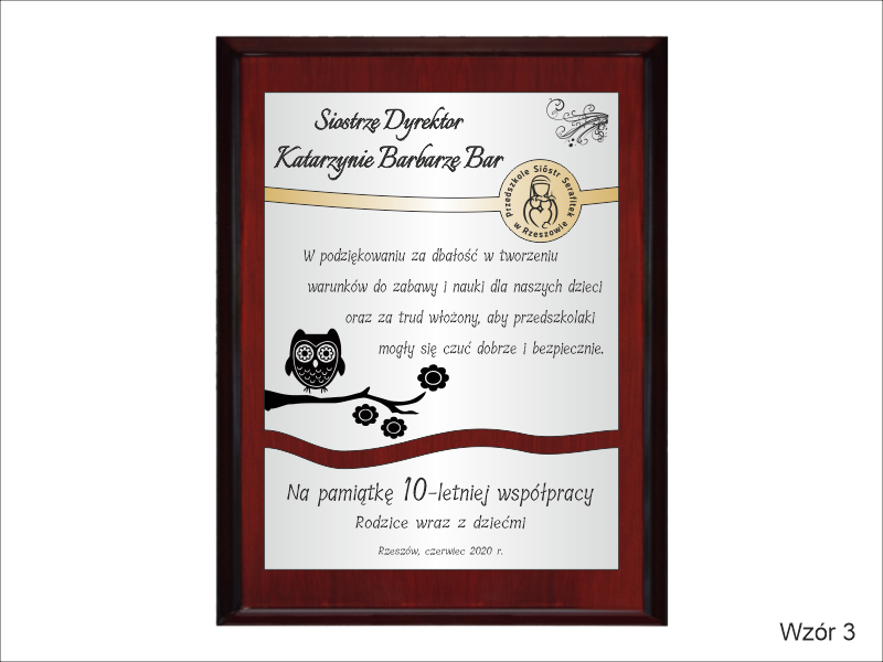- ze złotego lub srebrnego laminatu z grawerowaną dedykacją i ozdobną grafiką sowy,