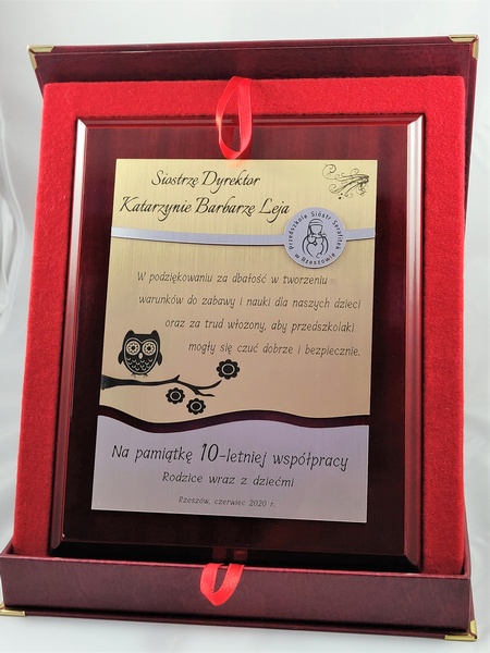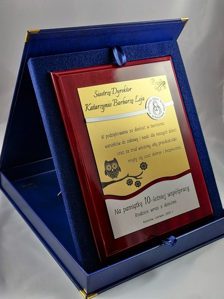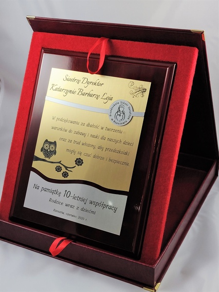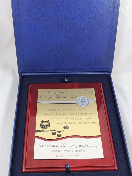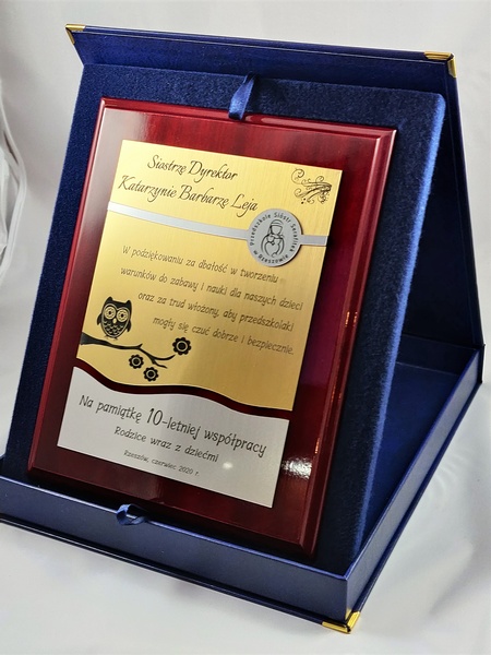 Podziękowanie dla Nauczyciela w formie drewnianego, grawerowanego dyplomu okolicznościowego.