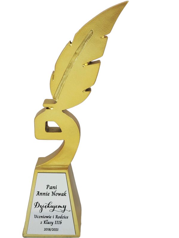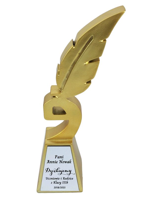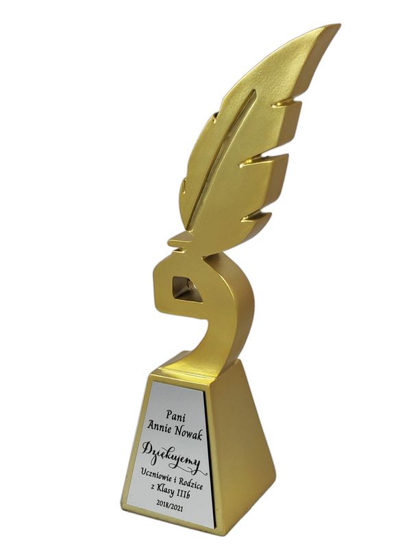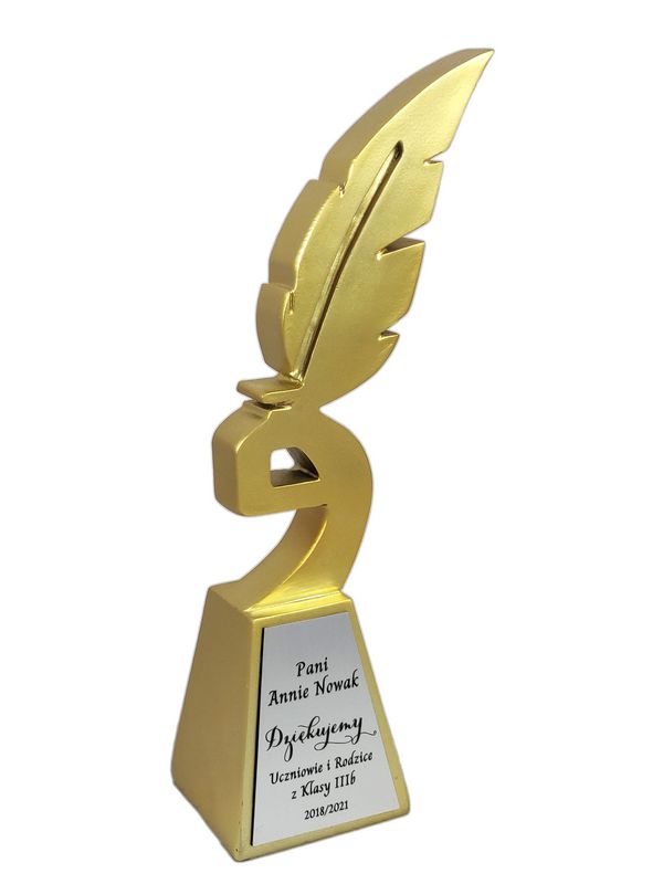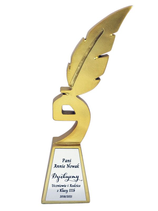 Podziękowanie dla Nauczyciela w postaci złotej odlewanej statuetki w kształcie gęsiego pióra z grawerem.