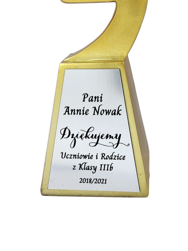 Na cokole statuetki wykonany jest pamiątkowy grawer dedykacji z podziękowaniem dla Nauczyciela.