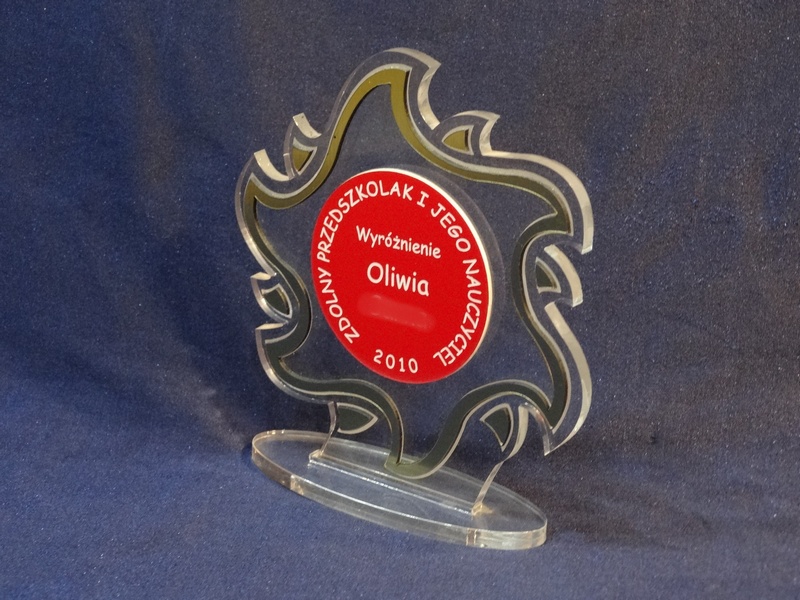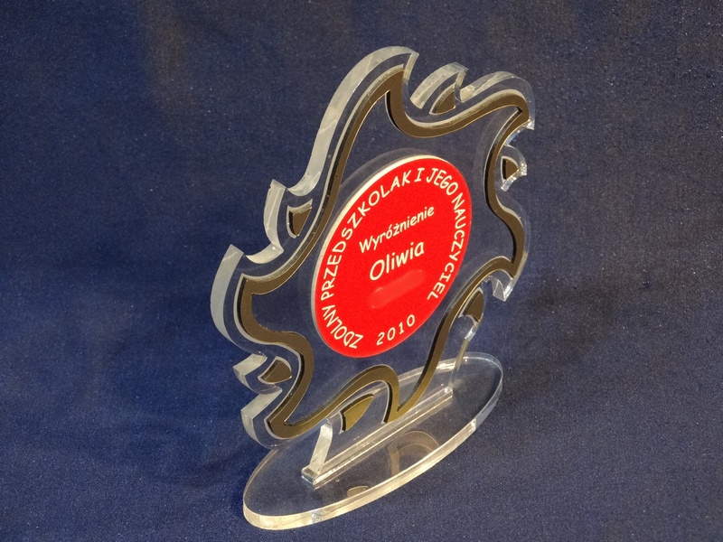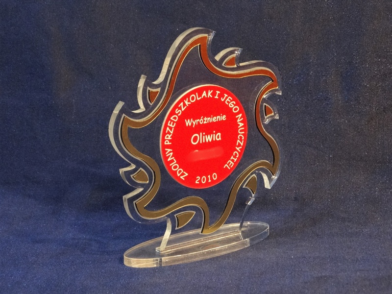 Wyróżnienie lub nagroda w konkursie w formie statuetki wykonanej z pleksi i laminatu z grawerem.