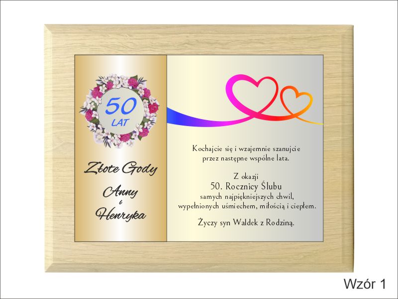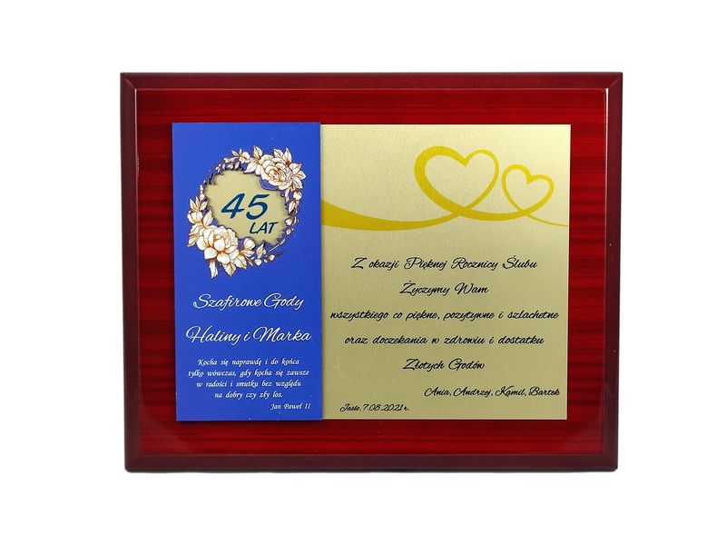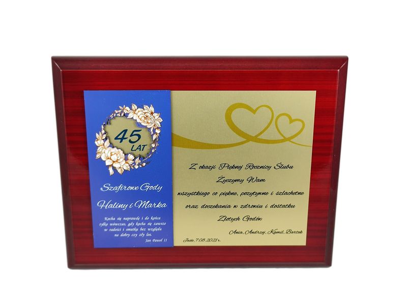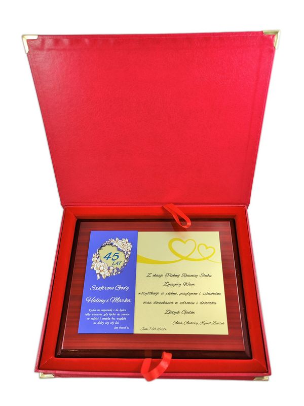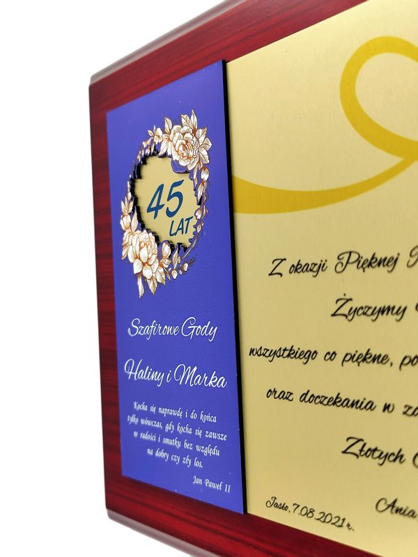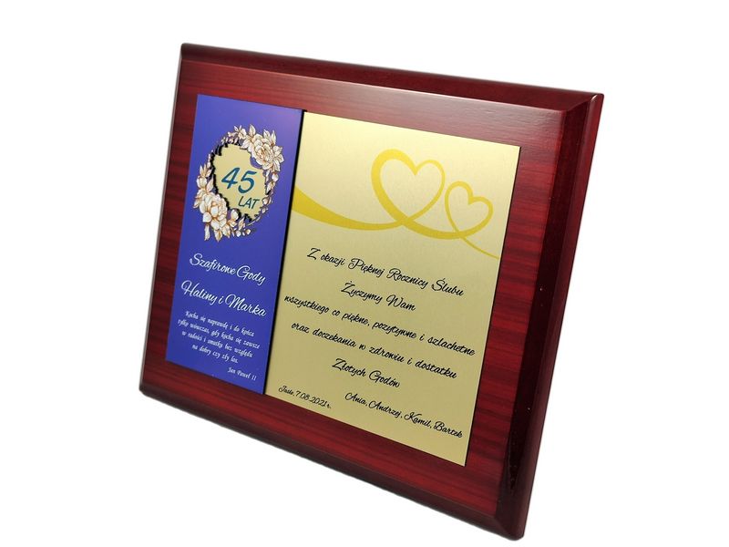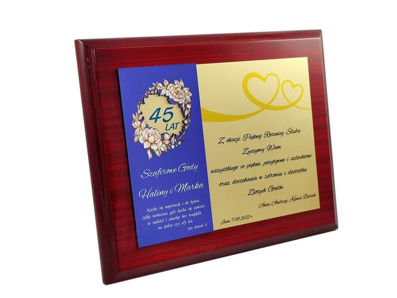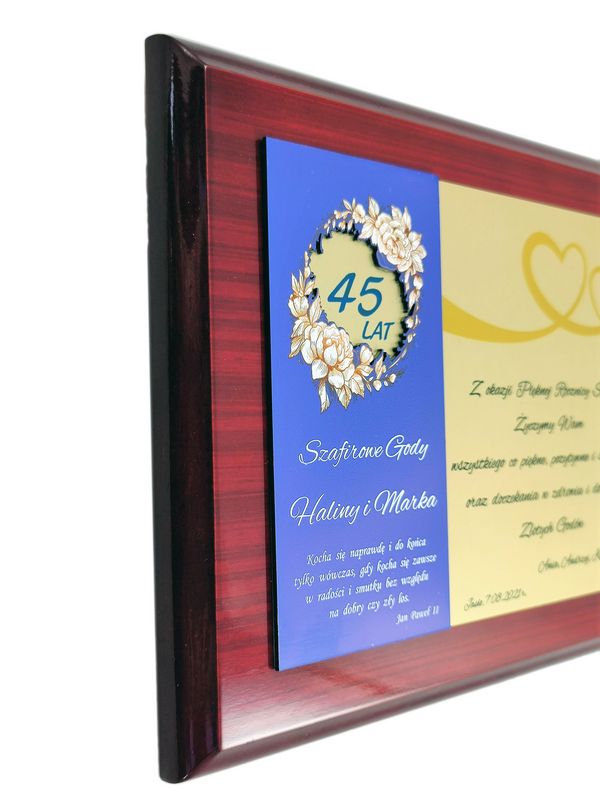 Pamiątkowy okolicznościowy dyplom z okazji Rocznicy Ślubu wykonany na drewnianym lakierowanym podkładzie.
