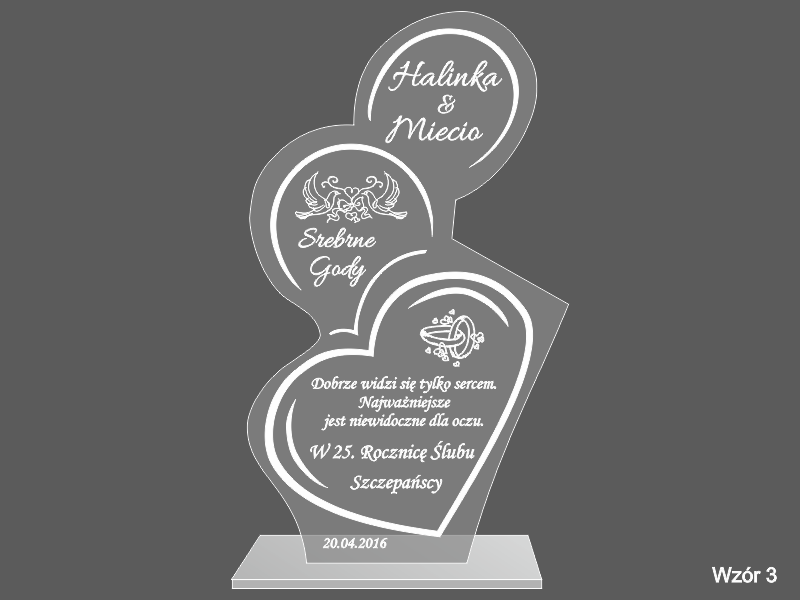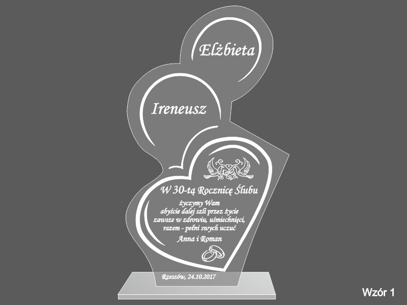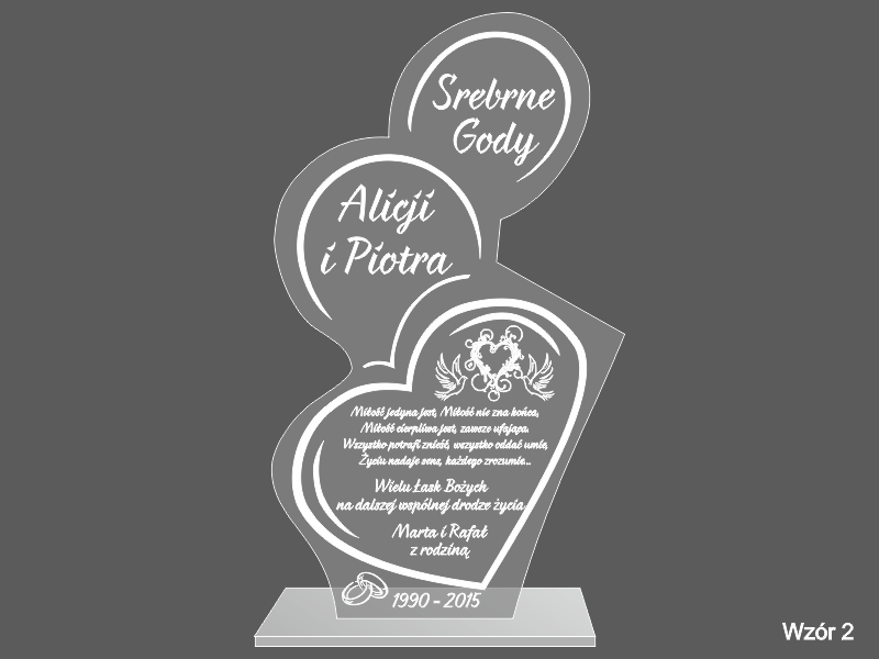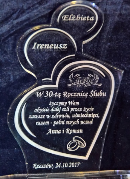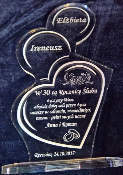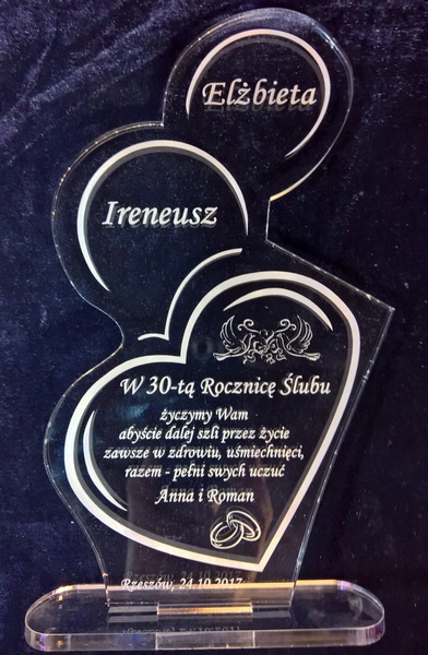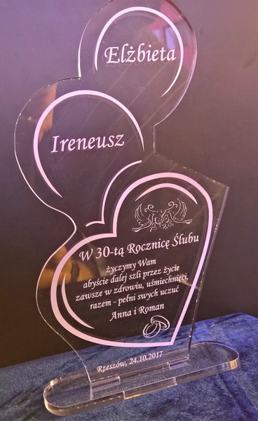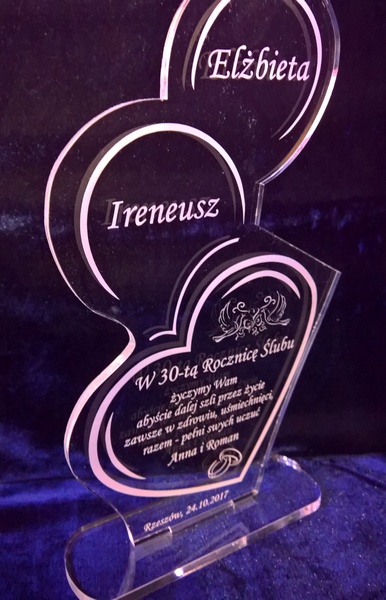 Statuetka wykonana z bezbarwnej pleksi z grawerem dedykacji i ozdobnych grafik na pamiątkę Rocznicy Ślubu.
