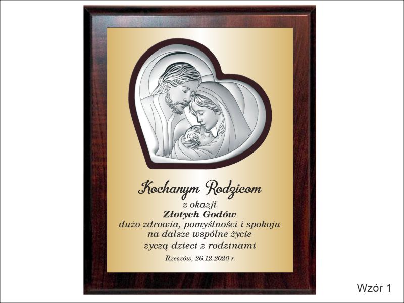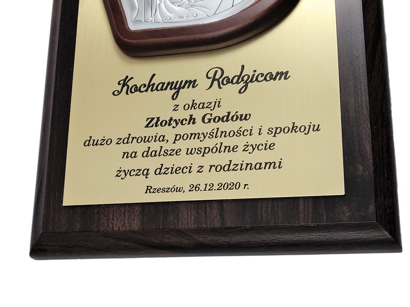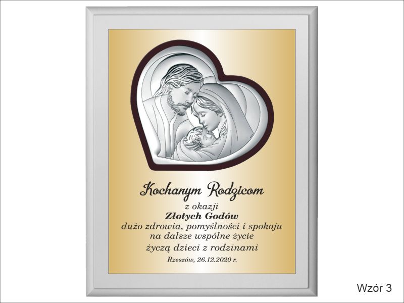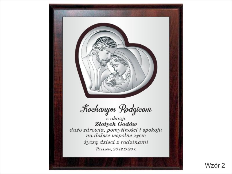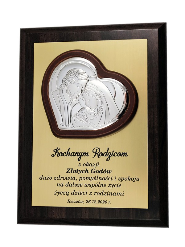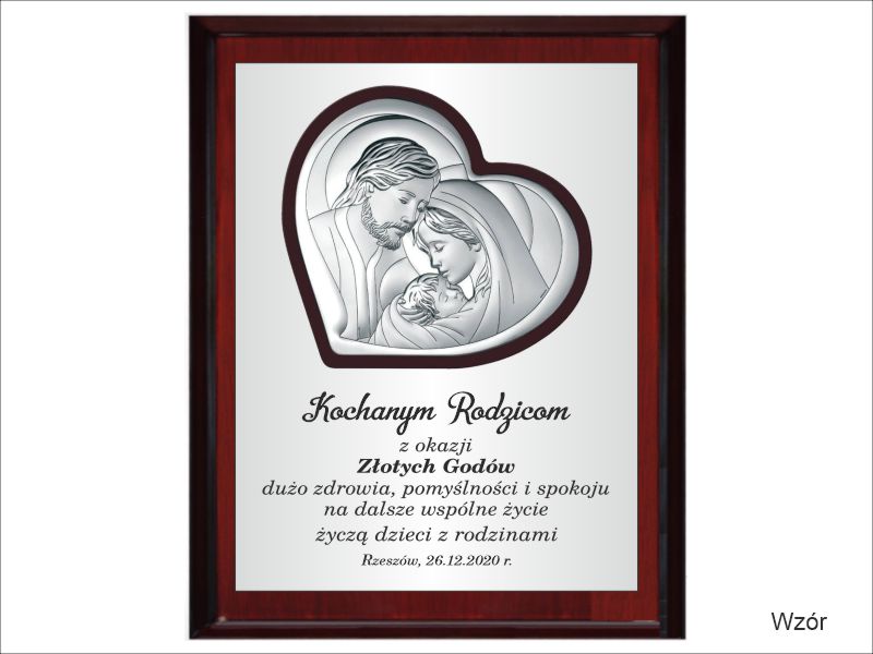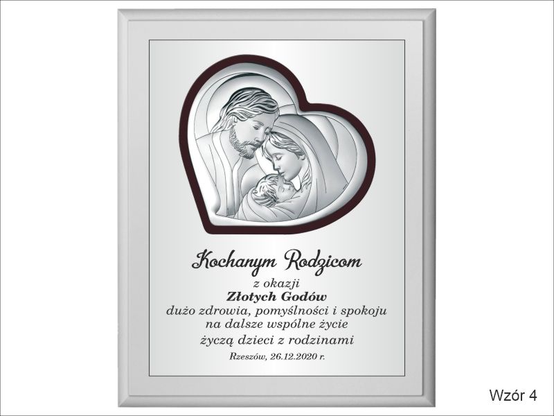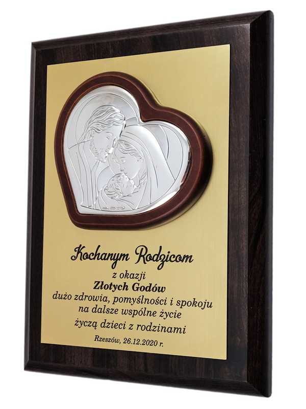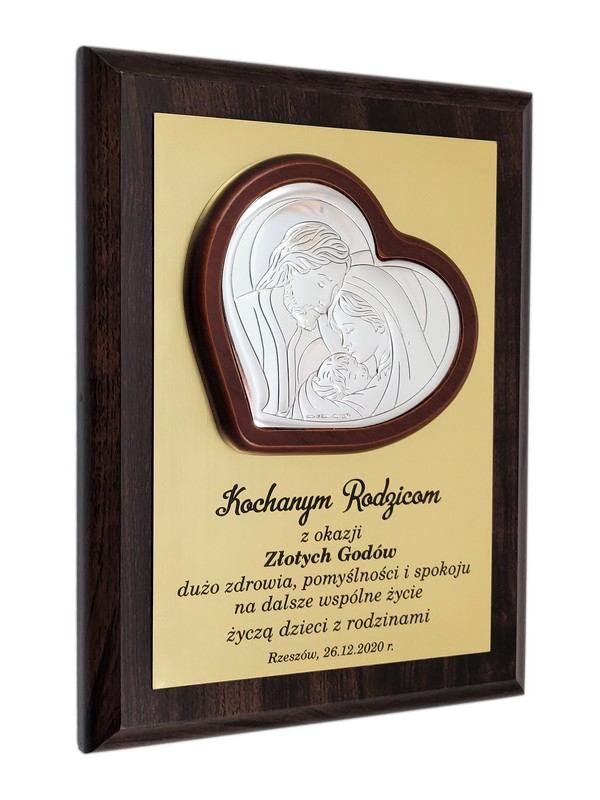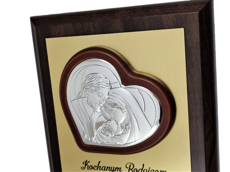 Prezent z okazji rocznicy ślubu w postaci wyjątkowej pamiątki - srebrnego obrazka z wizerunkiem św. Rodziny umieszczonego na drewnianym podkładzie.