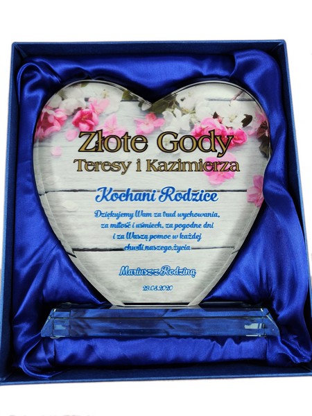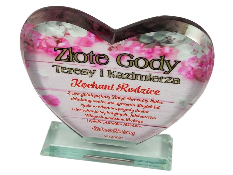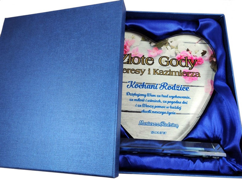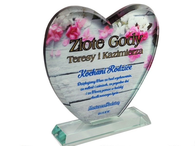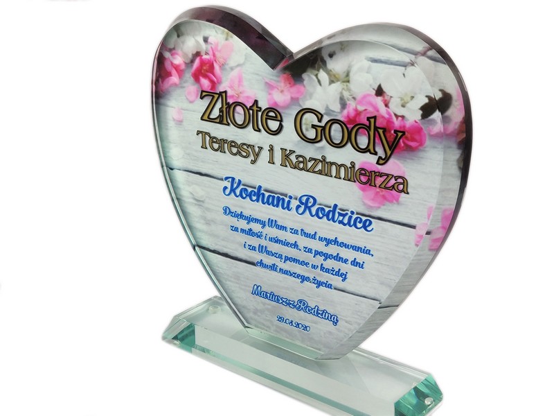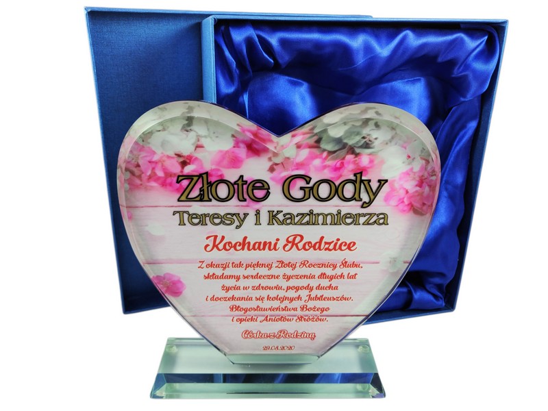 Prezent z okazji Rocznicy Ślubu w postaci pamiątkowej statuetki szklanej w kształcie serca z nadrukiem dedykacji.