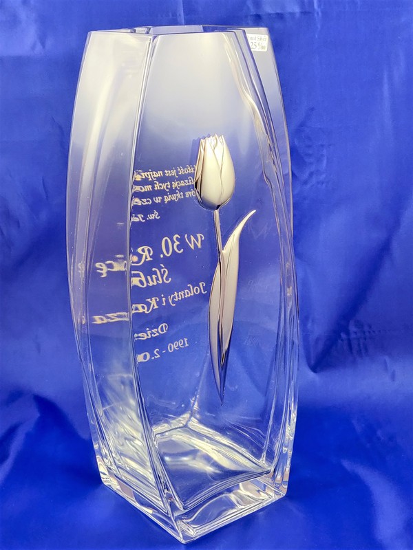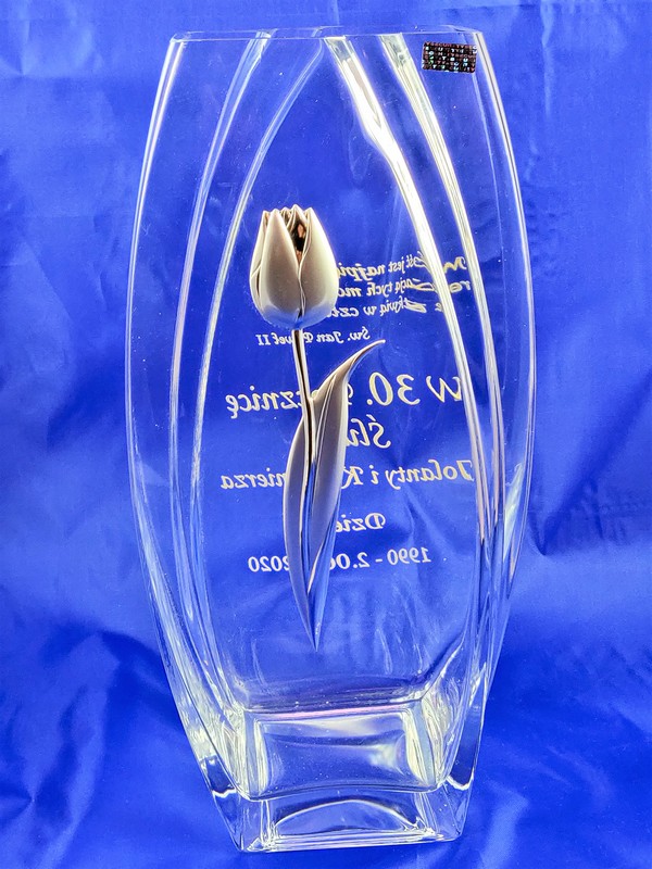 Prezent na rocznicę ślubu w postaci szklanego ozdobionego dużym srebrnym tulipanem wazonu z grawerem.