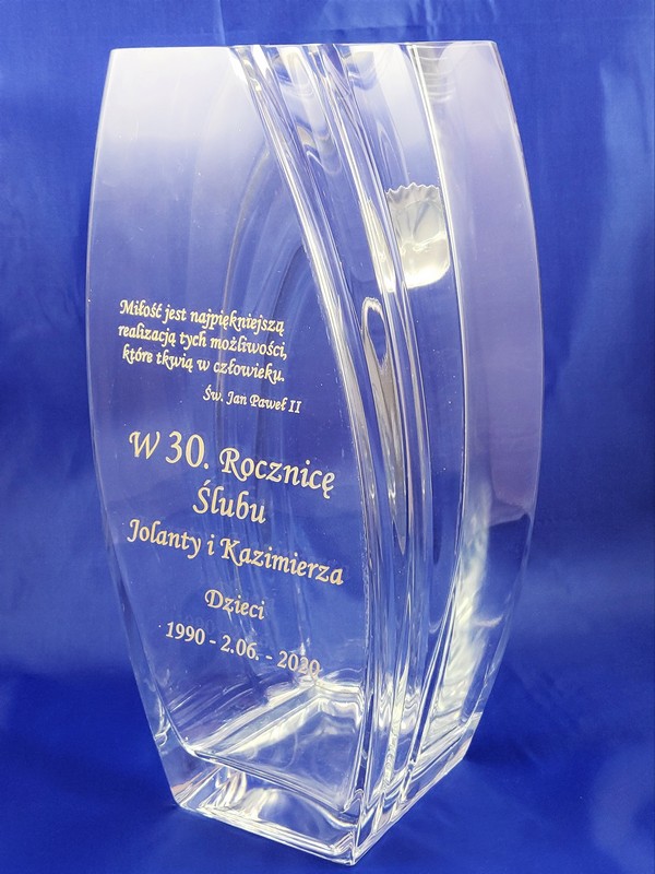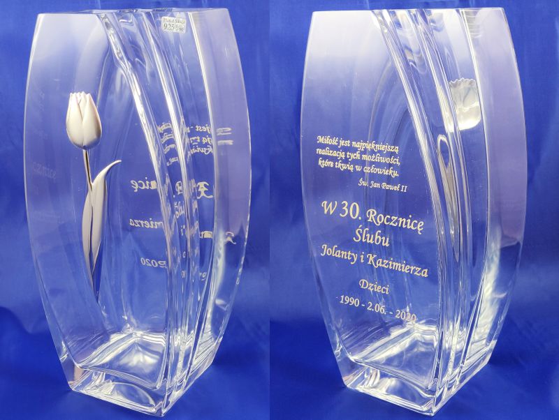 Na wazonie wykonany jest grawer ozdobnej dedykacji na pamiątkę obchodów rocznicy ślubu.
